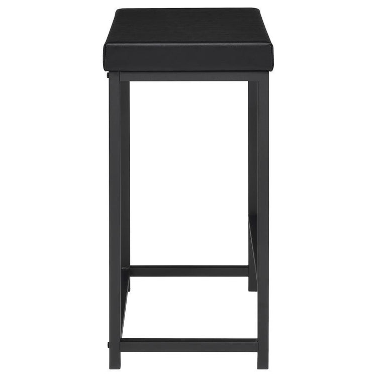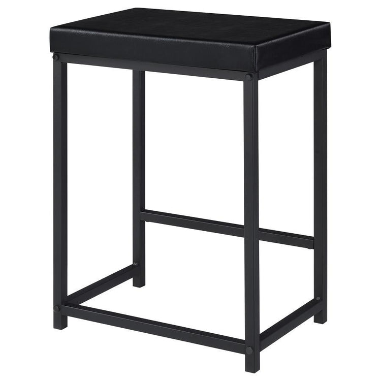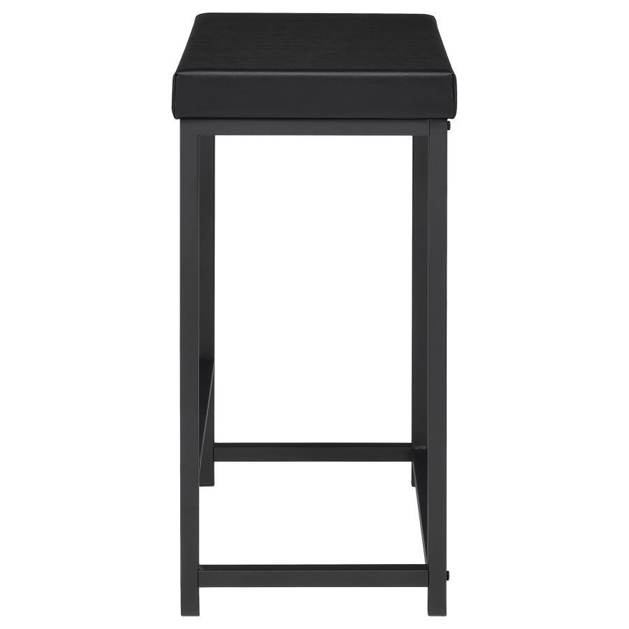 - Two matching barstools are backless to tuck underneath and feature a black finish with black faux leather and padded seats