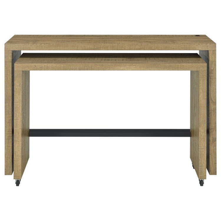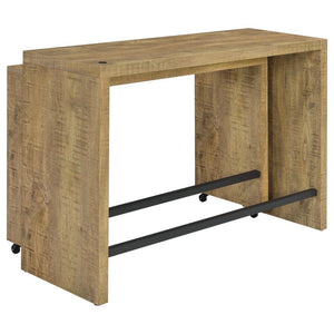 The ultimate multi-tasker, this modern four-piece counter height dining set includes two nesting tables and two backless stools. Its fresh, contemporary look features clean-lined silhouettes with a mango wood finish that's rich and natural. The larger table is stationary while the smaller table is on wheels, allowing you to create the configuration that best suits your space and activities, whether dining, working from home, or serving drinks to family and friends. Two matching barstools are backless to tuck underneath and feature a black finish with black faux leather and padded seats. The larger table is even equipped with a USB port that makes charging your phone or other small electronics smooth and seamless.