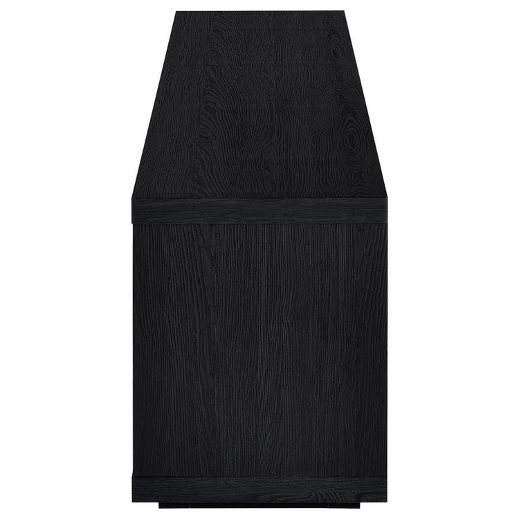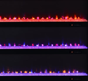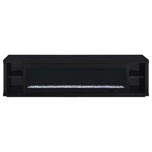 This sleek fireplace media console brings warmth and streamlined storage to contemporary living spaces. A wide electric firebox glows over crushed acrylic crystals, offering fifteen customizable flame colors operated by a wireless remote. Open side compartments with adjustable shelves store devices or décor, while rear cable management cutouts keep wires out of sight. Finished in classic black and crafted from engineered wood with a laminate veneer, it serves as a refined TV stand or entertainment center. Please note that this console does not include a heat function.