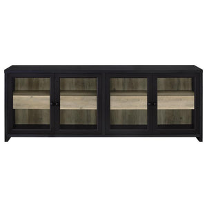 This expansive media console merges bold presence with discreet practicality. Framed in a striking black finish, four glass doors reveal warm wood-look interiors with hidden drawers behind each panel—perfect for tucking away remotes, devices, and essentials. The broad surface accommodates TVs up to 85 inches, while fixed shelving enhances display or storage flexibility. Crafted from engineered wood and clear glass with gunmetal hardware, it delivers a grounded, modern-rustic statement for any living room.