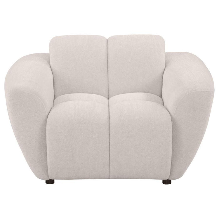 This sculptural accent chair from the Destino collection makes a bold statement with its wide splayed arms and chunky channel-tufted upholstery. Covered in soft greige chenille, it features a plush attached waterfall seat built with pocket coil construction for support that lasts. The grid-like contouring adds dimensional appeal, while its low, padded profile invites deep lounging. A modern silhouette grounded in comfort, it's the perfect standalone piece or complement to the full set.