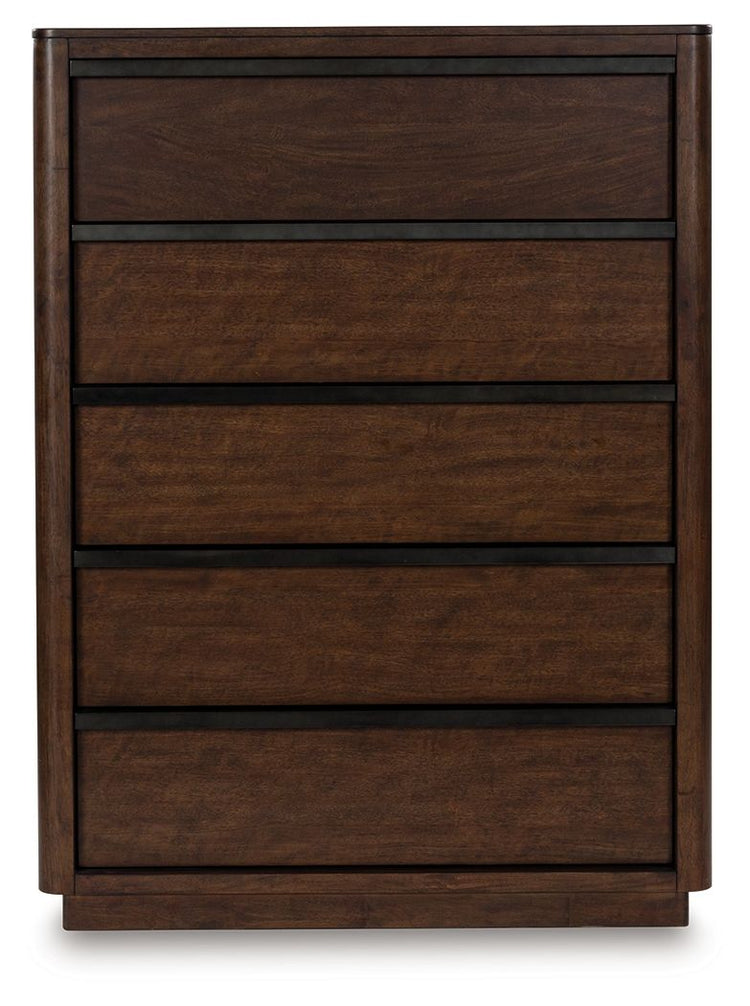 Casual contemporary styling with a decidedly modern vibe. This chest of drawers is warm and inviting with a rich dark brown finish, adorning your restful retreat with on-trend elegance. Full-length metal pulls in a matte black finish add a subtly cool touch to spacious storage drawers. What a simply stunning way to achieve the bedroom of your dreams.