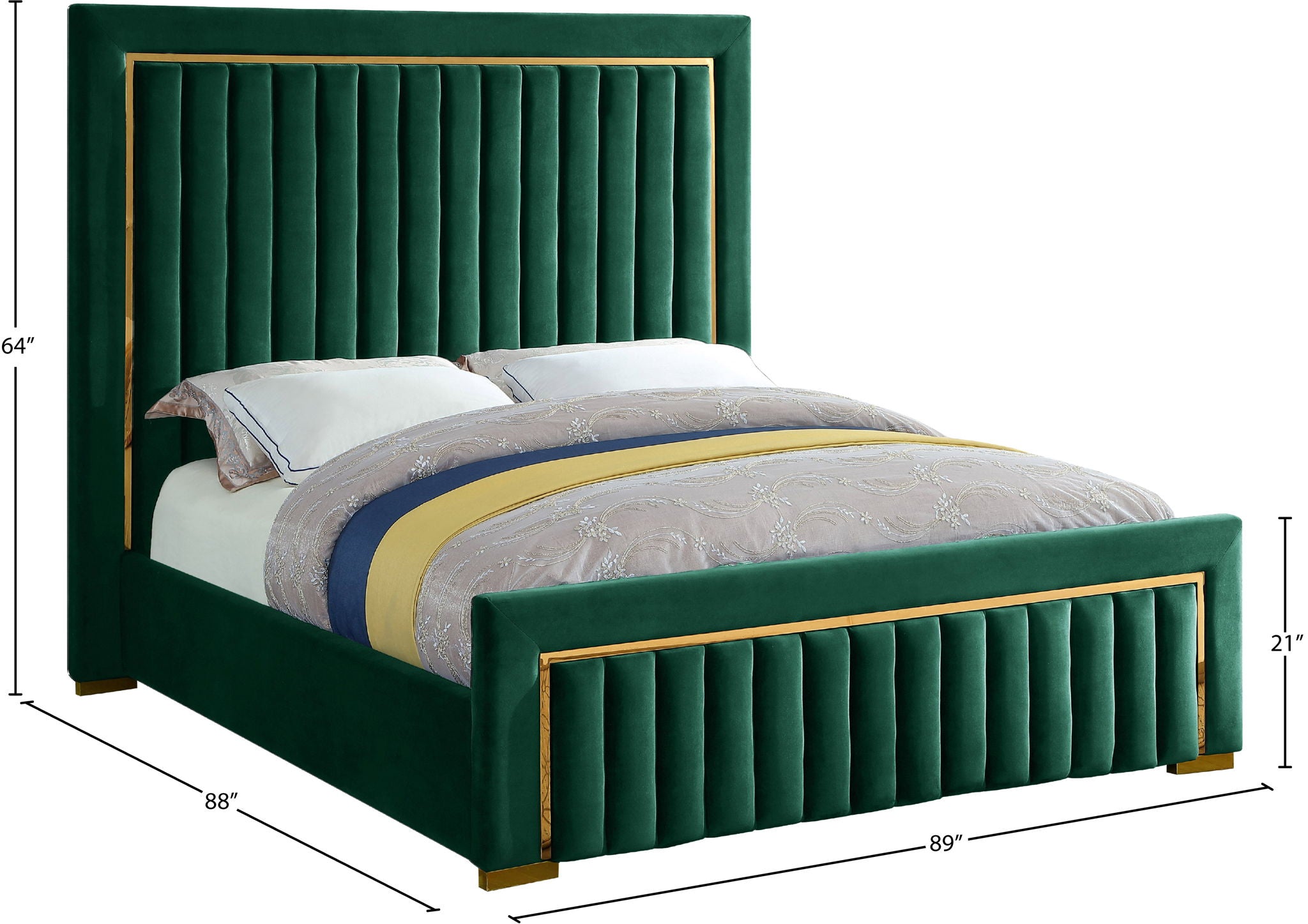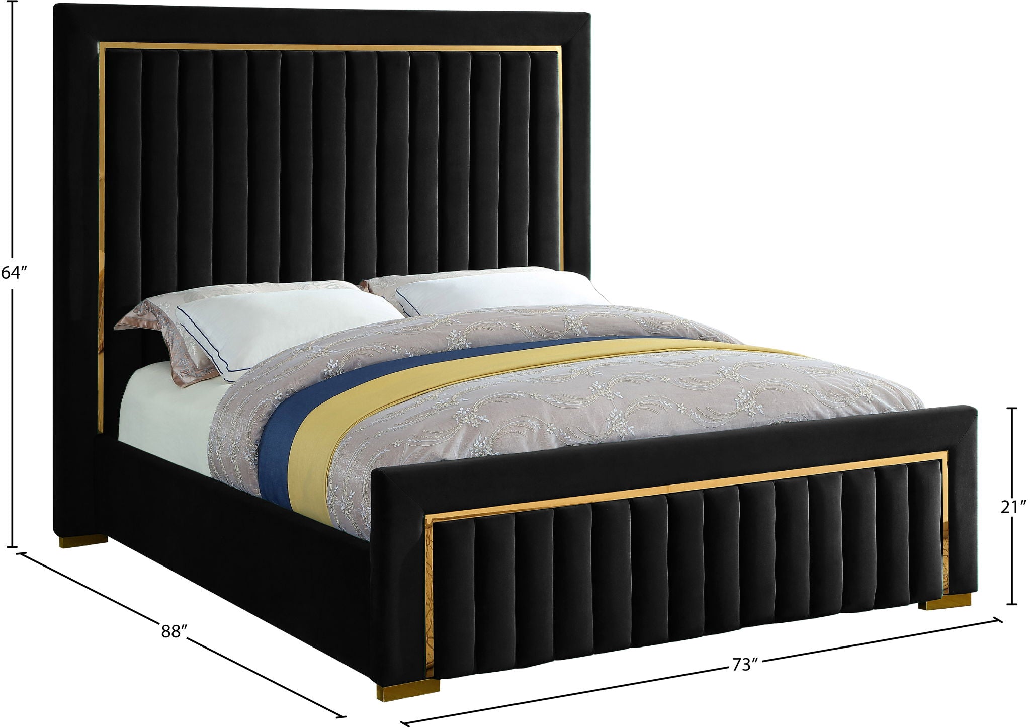 Ensconce yourself in regal modernity in this Dolce Bed. A super tall headboard makes this Dolce bed hard to ignore, ensuring it is the focal point in your bedroom sanctuary. The padded headboard is plump and welcoming, making it ideal for propping up against while you read the daily news or watch some TV. trim and channel tufting add to the headboard's luxurious look, lending it an air of regality and upscale refinement. The velvet upholstery is buttery-soft and lavish to the touch, making you feel like royalty with every nap.