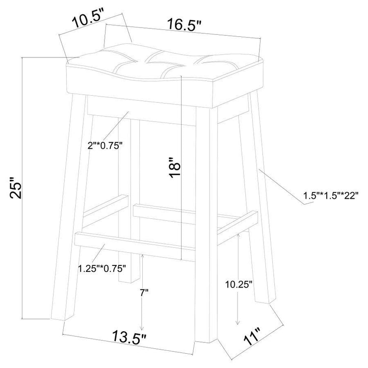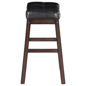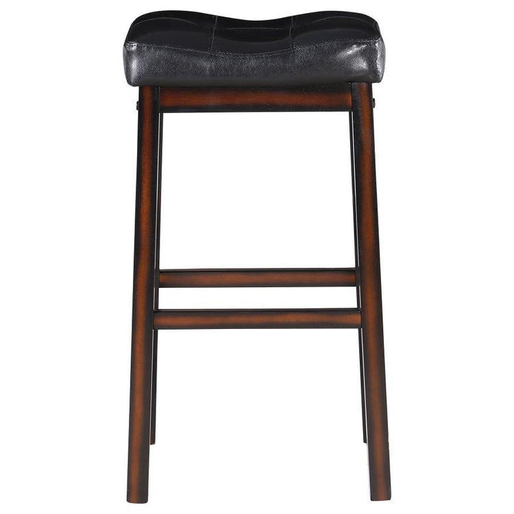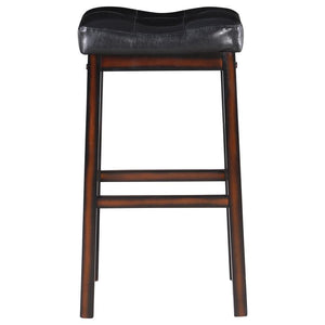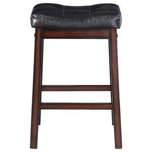 Simple and stylish, this contemporary stool is perfect for a kitchen island or home bar. A curved saddle-style seat offers optimal comfort with plush cushioning. Tufting adds dimensionality to a backless and armless silhouette. Black leatherette upholstery is always stylish, and is easy to care for. Angled legs are crafted in wood and feature a rich cappuccino finish, while built-in footrests offer easy relaxation.