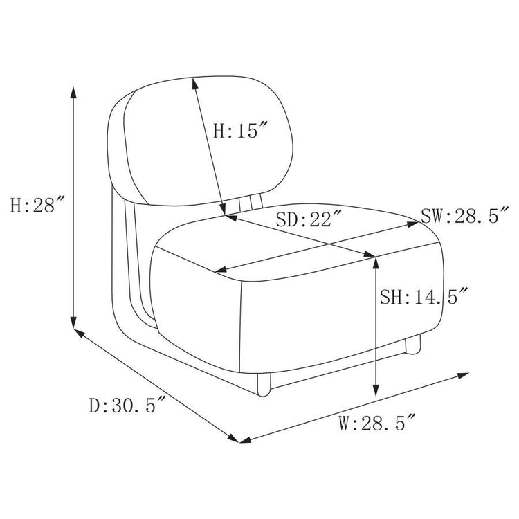 Change up the look and feel of your living room with the addition of a modern accent chair. It's an armless design with slipper chair inspirations, updated for a contemporary home. The chair features a legless silhouette with just a slim horizontal support structure underneath a thick seat cushion. Its oval back adds support, with an open design that lightens the look of the chair. A black finish on its supports completes the crisp, compelling design to perfection.