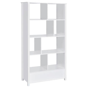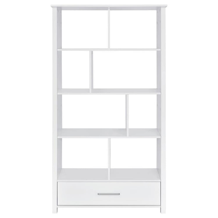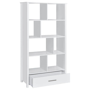 Asymmetrical shelves stack against one another to create this stunning, contemporary bookcase. A stylish, eye-catching addition to a home office, this minimalist bookcase invites you to organize office accessories or showcase decor and family photos. Eight separate sections divide items categorically if you wish, while a bottom drawer keeps items out of sight. The single drawer is adorned with a sleek, brushed zinc pull that further lends to the chic nature of this bookshelf. Versatile and functional, place this tall bookcase in the room of your choosing.