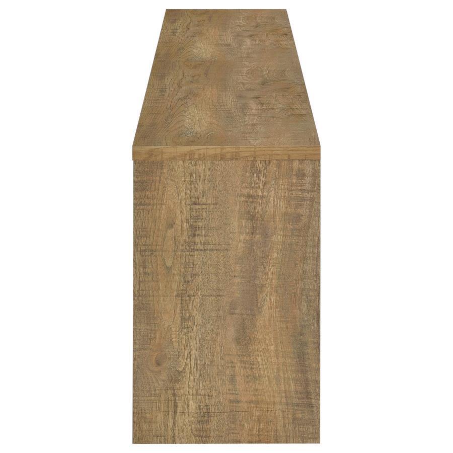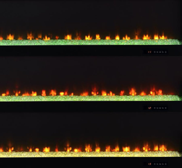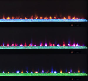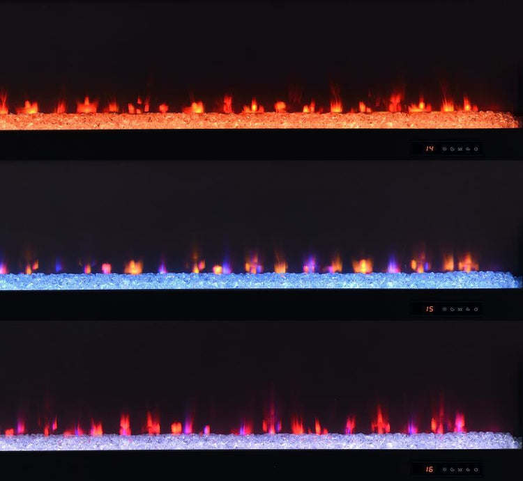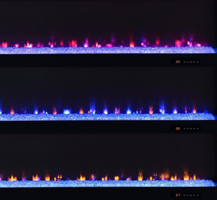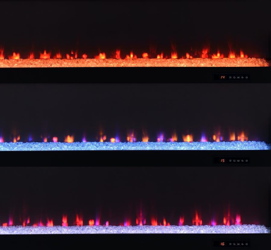This expansive fireplace media console delivers the perfect fusion of storage and style for spacious living areas. A wide electric firebox rests atop a bed of glistening crushed acrylic crystals, offering fifteen flame color options controlled by a wireless remote. Dual open cubbies provide easy access to devices, while two cabinet doors conceal adjustable shelves for flexible storage. Crafted from engineered wood with a mango-tone laminate veneer, each compartment includes rear cutouts for wire management. Please note that this console does not include a heat function.