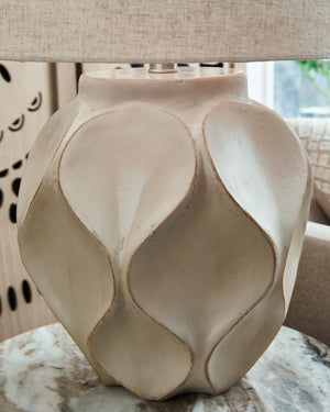 This table lamp takes a simply stylish approach to everyday illumination. Its glossy cream finish and neutral shade seamlessly pair with a variety of casual aesthetics. Cool curves give it an artisanal feel, instantly adding sculptural style to an accent table or desk.