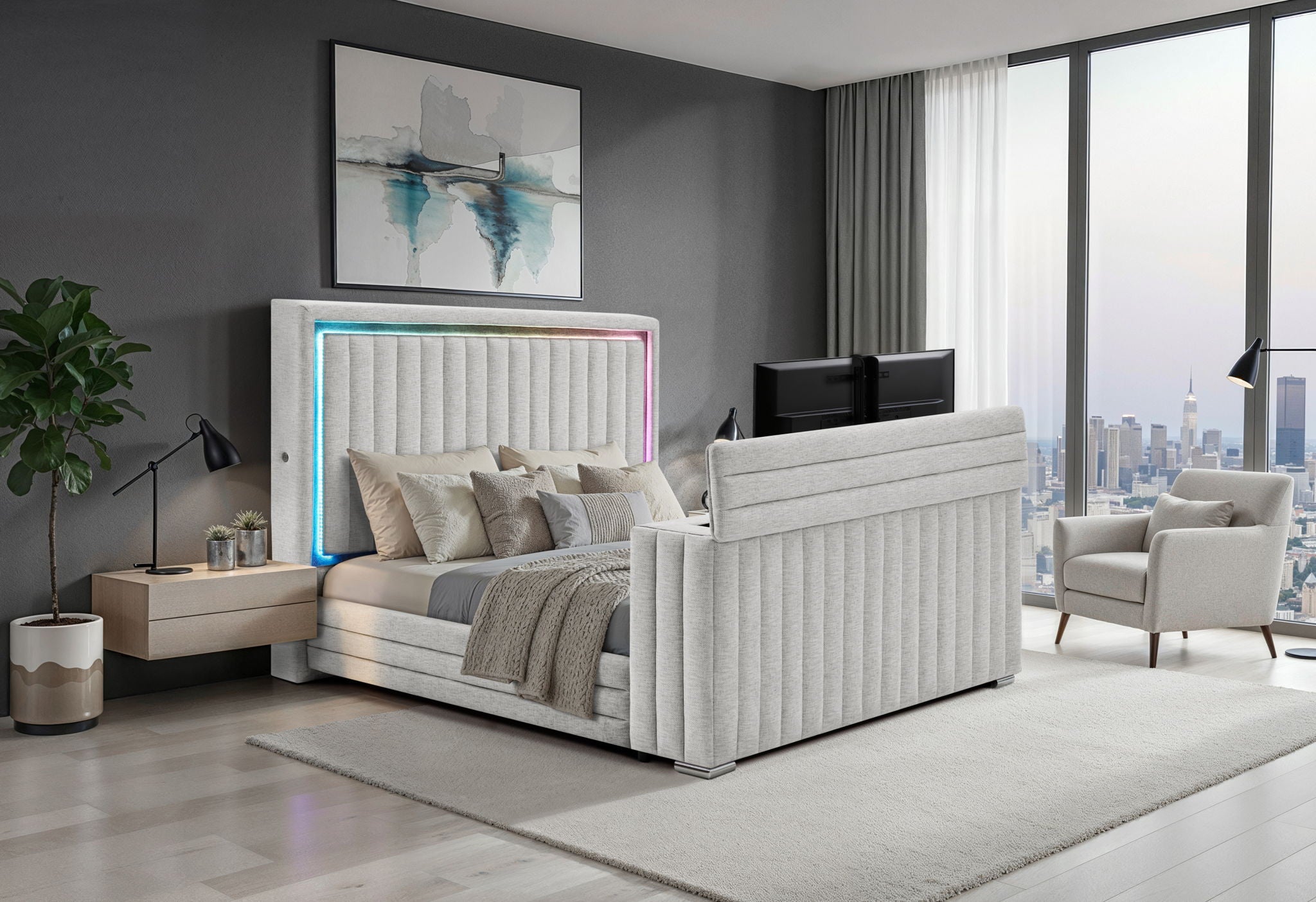 Experience the ultimate in modern comfort and innovation with the Elias Grey Bed with TV Lift and Fireplace Footboard by Global Furniture USA. Finished in a sophisticated light grey fabric with horizontal channeling, this bed delivers a clean, upscale aesthetic. The headboard features a built-in surround sound speaker system with multi-color LED lighting that syncs with the audio for an immersive experience. The footboard takes luxury further with a smooth TV lift mechanism and integrated fireplace, creating a relaxing, resort-style retreat right in your own bedroom. Bold, innovative, and undeniably upscale, the Elias Grey Bed with TV Lift and Fireplace is the perfect fusion of technology, comfort, and modern designcrafted for those who expect more from their bedroom. This bed is paired perfectly with the Emma Black cased goods. The simple and modern design still leaves the bed as the main feature.