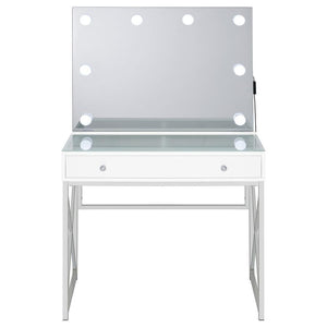 Elevate your morning rituals with a compact, contemporary vanity set, including table, mirror and stool. Perfect for makeup and hair, the vanity shows off a bright white finish with a large drawer for stashing your daily necessities. On top, a lighted mirror adds Hollywood glamour while providing bright illumination so you can see every detail as you get ready for everything from running errands to a girl's night out. The desk is accompanied by a backless stool, providing an easy spot to sit as you prepare for the day. The stool features a base with X-shaped braces to match the desk and includes a white faux leather seat with lovely padding that starts your day on the right foot.