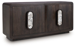 Function and style merge perfectly in this accent cabinet. Doors with oversized marble pulls open to reveal shelving, while the rounded edge design and espresso brown finish provide distinctive on-trend touches. Whether you use it to conceal clutter or as a TV stand, this exquisite piece defines modern elegance.