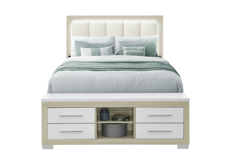 The Emma Queen Bed is the centerpiece of this stunning collection, blending modern elegance with unparalleled functionality. The padded white upholstered headboard features an LED light and USB ports for added convenience, perfect for reading or charging devices. With its ingenious all-around storage design which provides ample space for bedding, clothing, and more. The two-tone natural wood and white finish completes the contemporary look, making this bed a true standout in any bedroom.