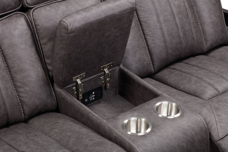 Spice up your movie nights with the Equinox Power Console Loveseat. Each power seat features armrest storage and independently operating power headrests for personalized comfort. The loveseat's center console offers additional cup holders and a lift-top storage console so you never lose the remote again! Cool ambient floor lights at the bases, upholstered channels on the back and leg rests and oversized welt cord ensure that Equinox is the best looking seat in the house!