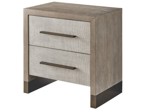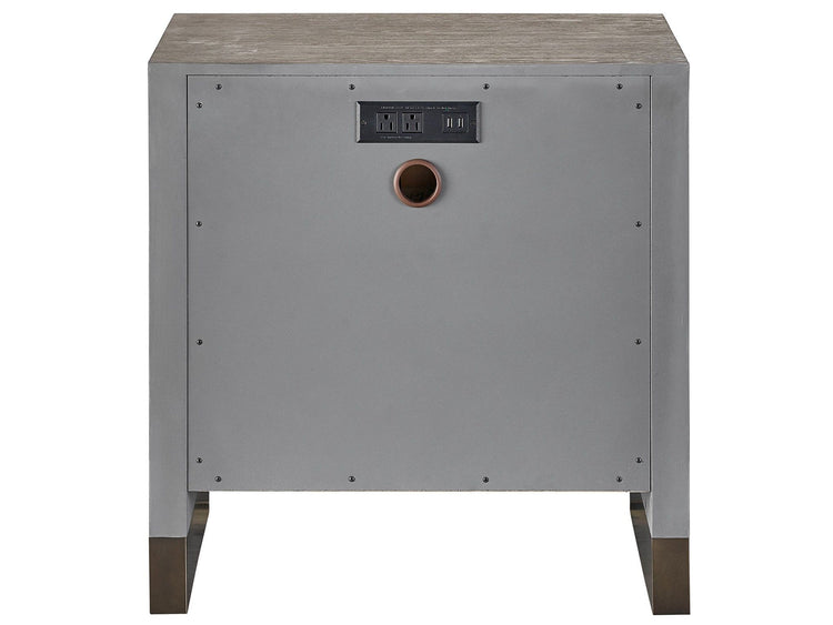 Two spacious drawers with lightly textured faux linen drawer fronts are encapsulated by a weathered oak finish and outfitted with USB ports and outlets.