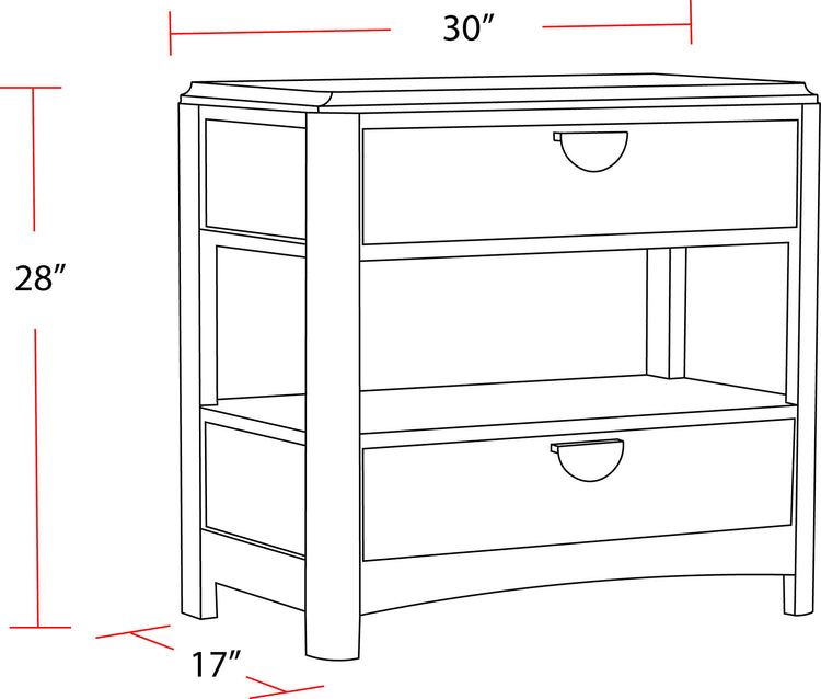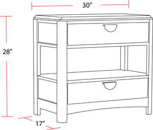 - Two-drawer design offers plentiful storage as well as and open shelf for favorite books and bedside essentials