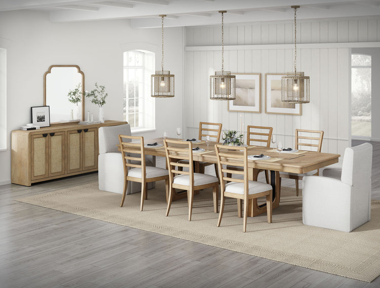 With rounded profiles, a fresh finish and abundant storage options, these inspired dining pieces from the Escape whole home collection make every meal a special occasion. Its unique designs draw upon a palette of nature-inspired materials, including authentic oak wood grains in a soft natural finish, genuine sandstone, woven cane, warm bronze metal, and slubby woven textiles.