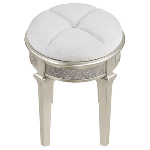 Sleek and sophisticated, this glam stool is the ideal finishing touch for the matching Evangeline vanity desk. Elegantly appointed, it boasts a chic oval shape complete with graceful tapered legs that provide durable support as you primp and prime for the day, or evening, ahead. Its padded seat shows off ivory chenille upholstery, offering just the barest hint of contrast to a soft silver frame finish. Glittering diamond-like trim adorns the apron of the stool, offering the ultimate in sophistication and refinement. When not in use, the backless stool tucks easily under your vanity desk, keeping your bedroom tidy and walkways clear.