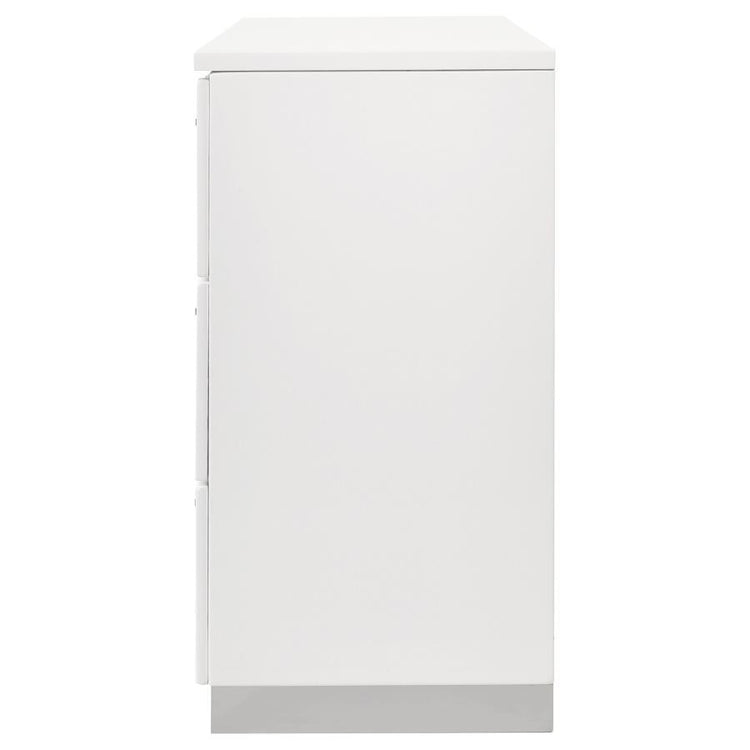 Keep your space organized with the clean lines of this contemporary 6-drawer dresser. A high gloss finish delivers a polished, modern aesthetic, while chrome-finished metal handles and feet add refined contrast. Each drawer glides smoothly on metal extension hardware, providing easy access to clothing and essentials. Designed for both style and function, this dresser brings practical storage to modern bedrooms.