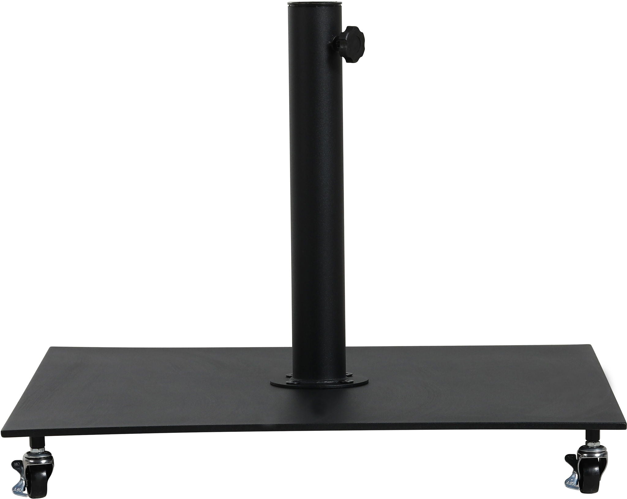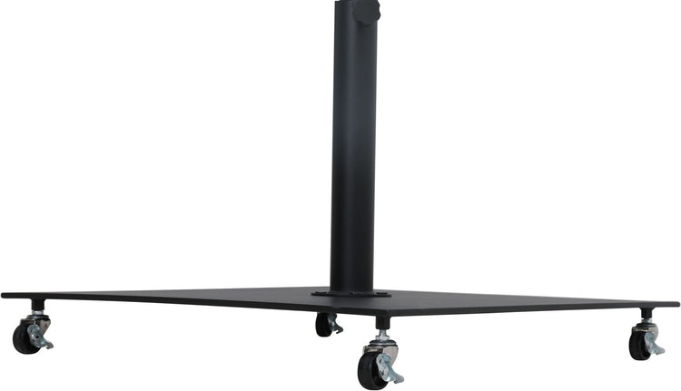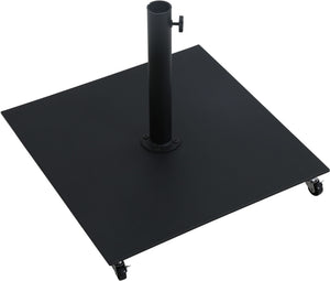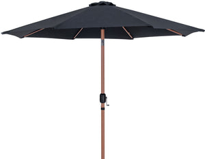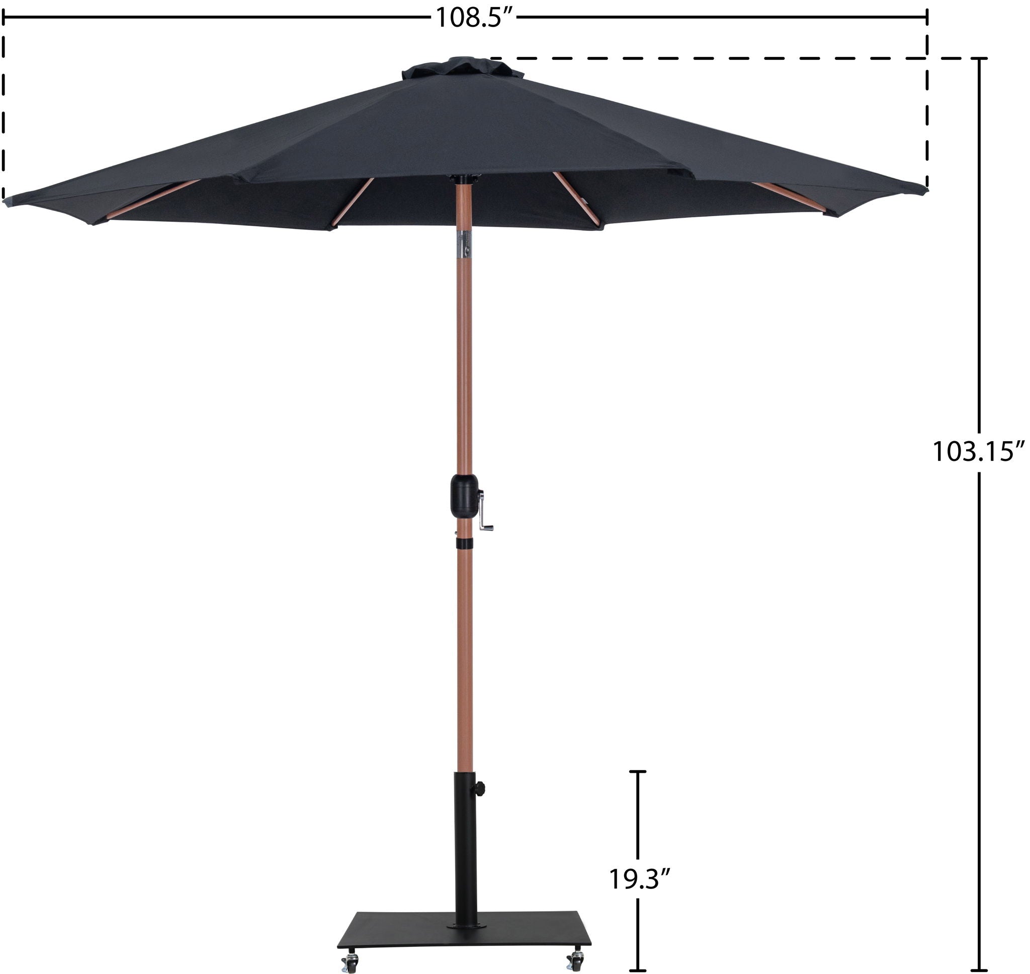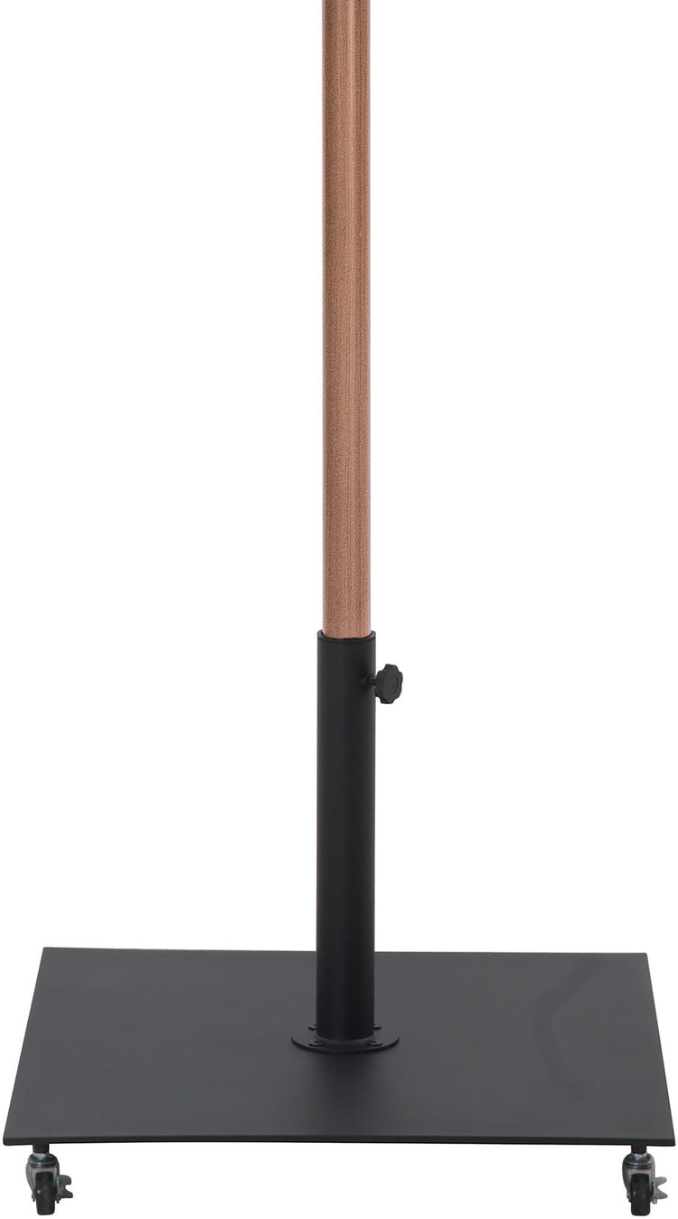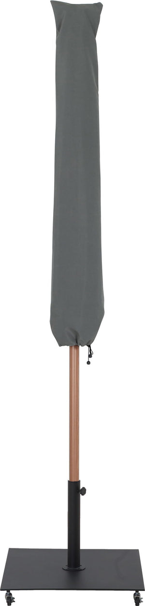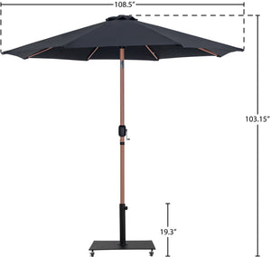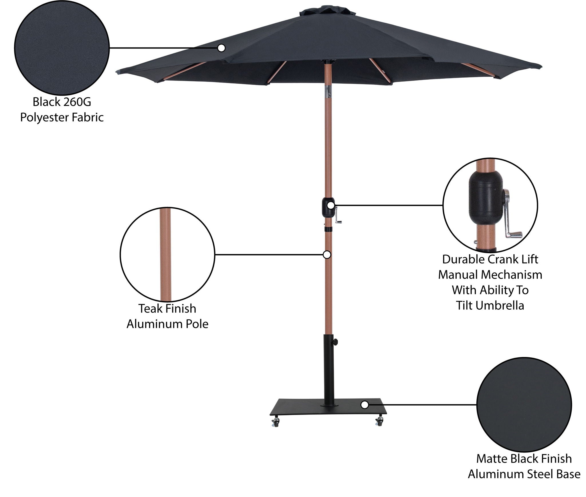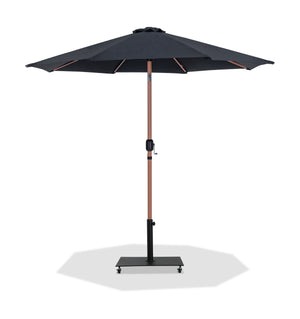 Bask in the shade wherever it's needed when you bring home this Fiji fabric and teak aluminum patio umbrella with matte black base set. This ingenious umbrella and base can be used as a standalone umbrella on a deck or patio - or add it to your choice of table for a sturdy solution for hiding from the sun's rays. The aluminum pole weathers the elements like a champ, and the umbrella is crafted from water-resistant fabric for a beautiful, lasting look. Casters on the base make for easy portability.