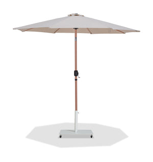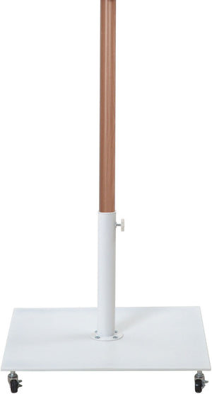 Bask in the shade wherever it's needed when you bring home this Fiji fabric and teak aluminum patio umbrella with matte white base set. This ingenious umbrella and base can be used as a standalone umbrella on a deck or patio - or add it to your choice of table for a sturdy solution for hiding from the sun's rays. The aluminum pole weathers the elements like a champ, and the umbrella is crafted from water-resistant fabric for a beautiful, lasting look. Casters on the base make for easy portability.