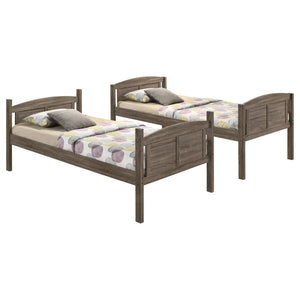A casual country vibe carries the space with this rustic bunk bed, perfect for compact bedrooms and shared sibling spaces. A weathered finish lends a neutral hue to transform a space into a serene, restful retreat. Along the top bunk are safety guardrails to keep younger ones secure as they sleep soundly through the night, complete with a built-in ladder for climbing up. The arched headboard and footboard offer grace and style, along with the plank paneling as the bottom bunk invites baskets, bins and more to organize personal items. Last but not least, this versatile bunk bed can be separated to create individual beds when siblings wish for their own space.