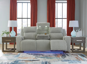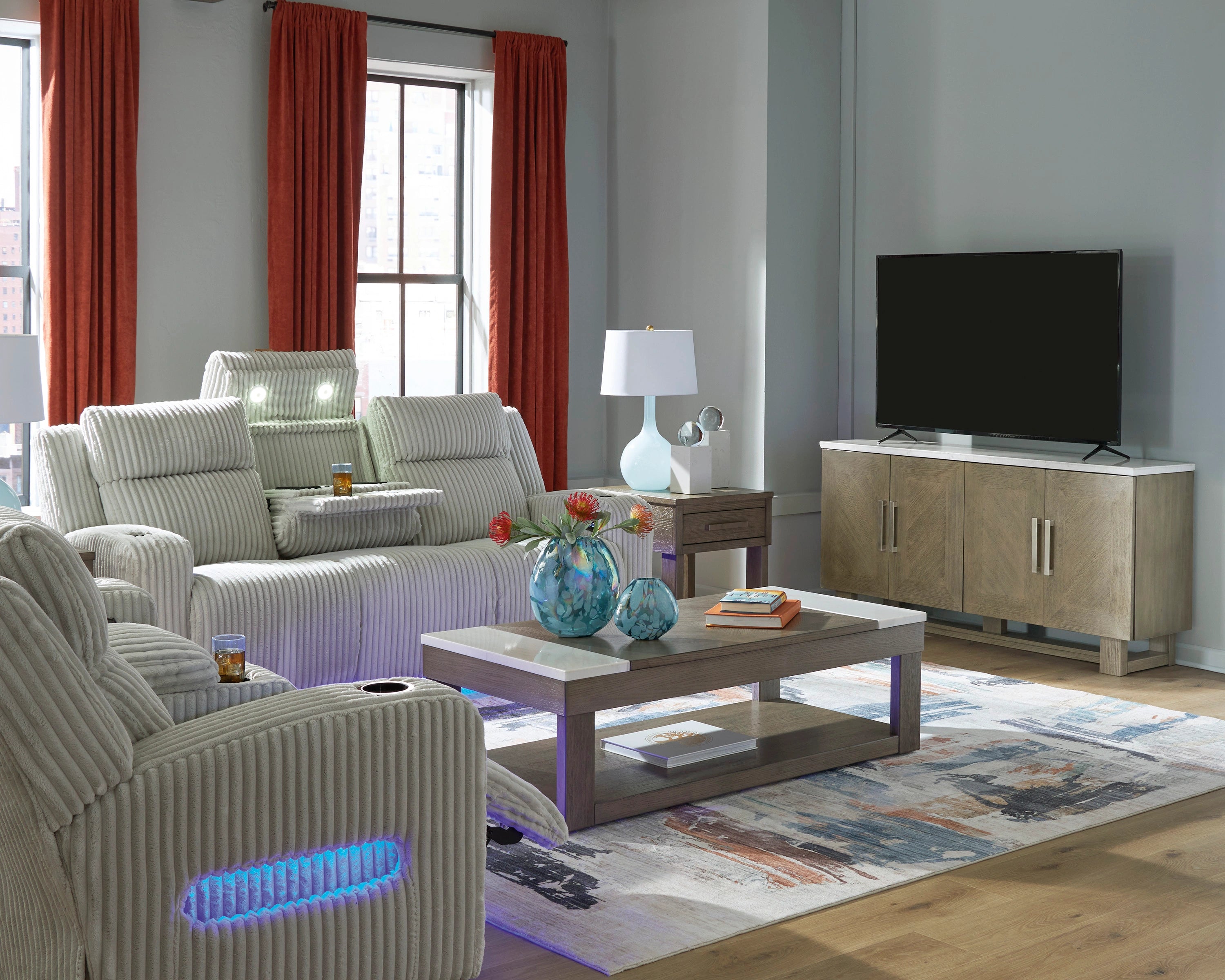 The sofa includes a drop-down table with dual cup holders, USB and wireless charging, overhead reading lights, and a built-in Bluetooth-compatible sound system. -