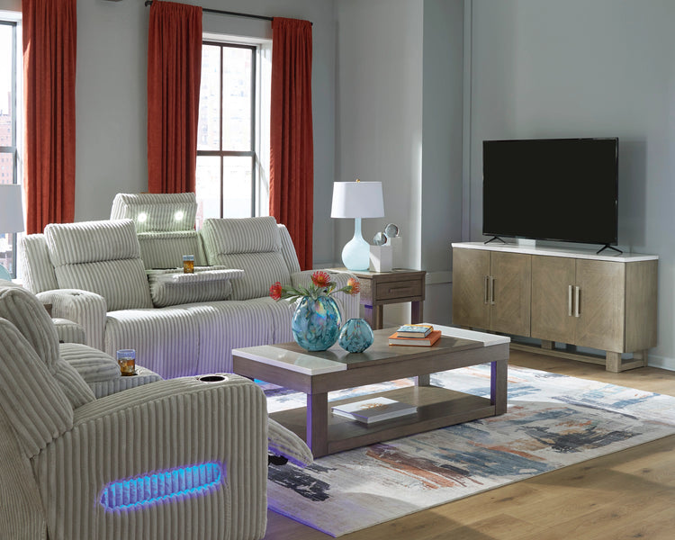 Under-base LED accent lighting adds modern ambiance, while the sofa's integrated audio system lets you connect wirelessly for immersive sound. -