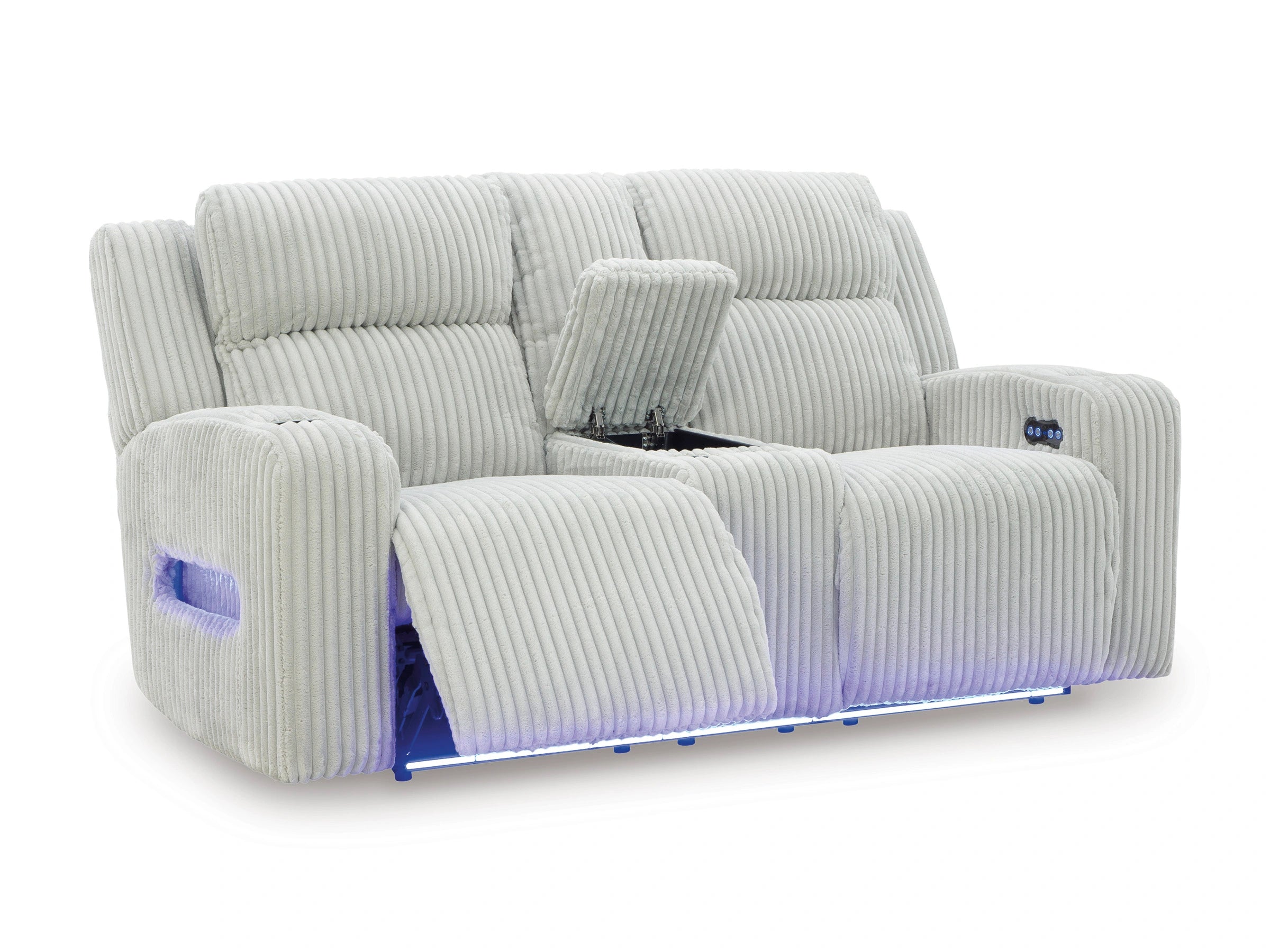 The loveseat is designed with a center storage console, dual cup holders, and hidden compartment space—perfect for keeping remotes, chargers, and more within reach. -
