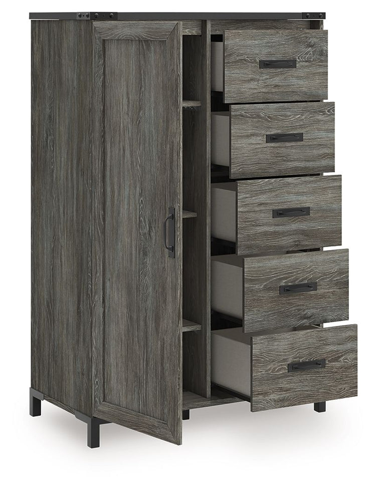 Cool, casual style is for all ages. With this dressing chest, they get the function they need plus the refined design you love. Approachably neutral in a rustic warm gray, it’s adaptable enough to pair with an assortment of existing colors and room decor. Faux metal detailing on the corners lends an industrial edge. The chest's smooth-gliding drawers and cabinet space offer storage for clothes, toys and everything in between.