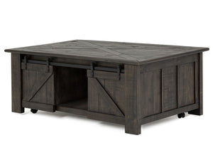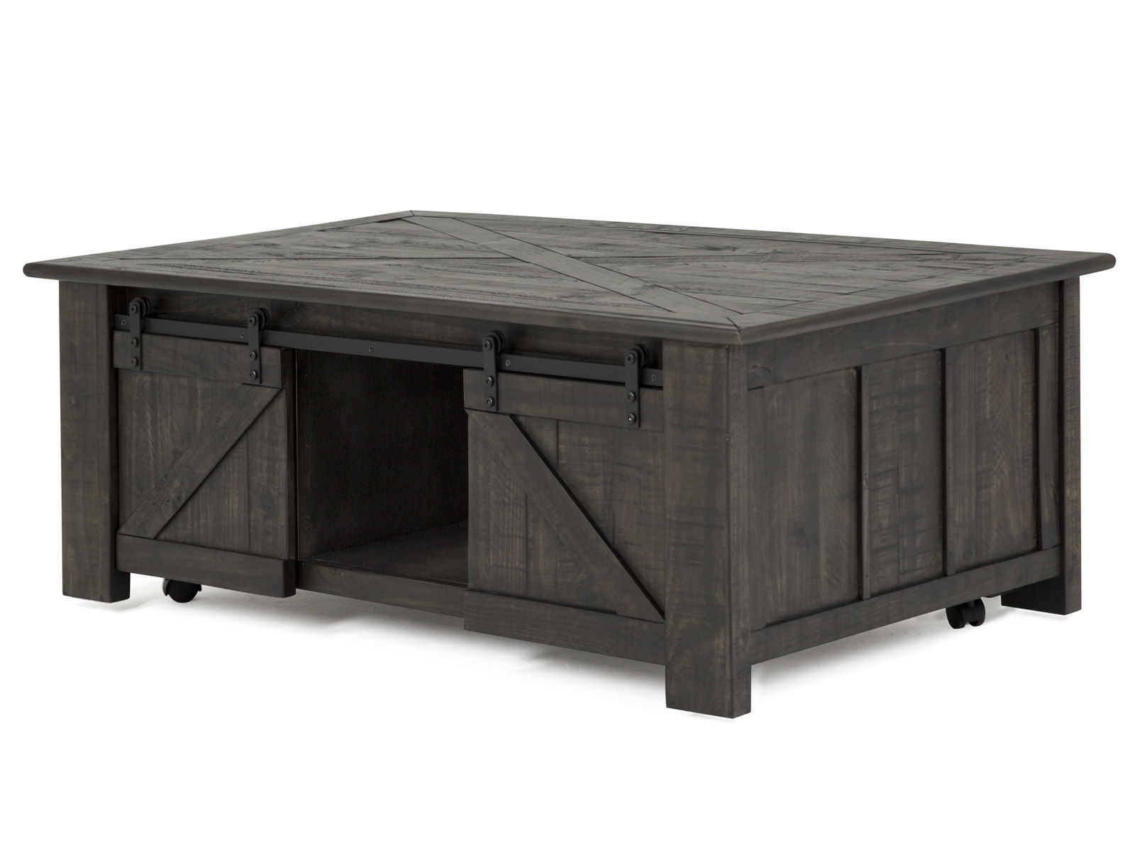 Designer-inspired Weathered Charcoal is the rustically sophisticated finish for the Garrett table collection. The rectangular lift- top cocktail table features sliding board and batten doors offset by metal hardware, a lift-top for functional ease, and casters for this charming cottage treasure. Garrett radiates the relaxed lifestyle of the Napa Valley region and lures you to relax, unwind, and breathe in the beauty as you enjoy this distinctive style!