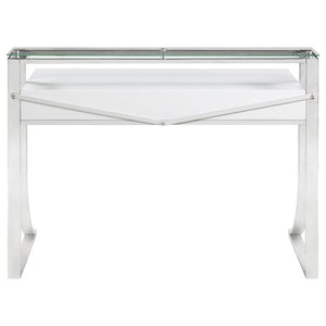 Add an edge of contemporary flair to any living space. This sleek, stylish writing desk exudes glamorous appeal. Its eye-catching frame is expertly crafted with a gracefully curved silhouette. Its gorgeous, glossy white surface blends appealingly with its shining chrome legs. Complete with two felt-lined drawers with full extension glides, this desk enhances any home office with convenience and modern style.