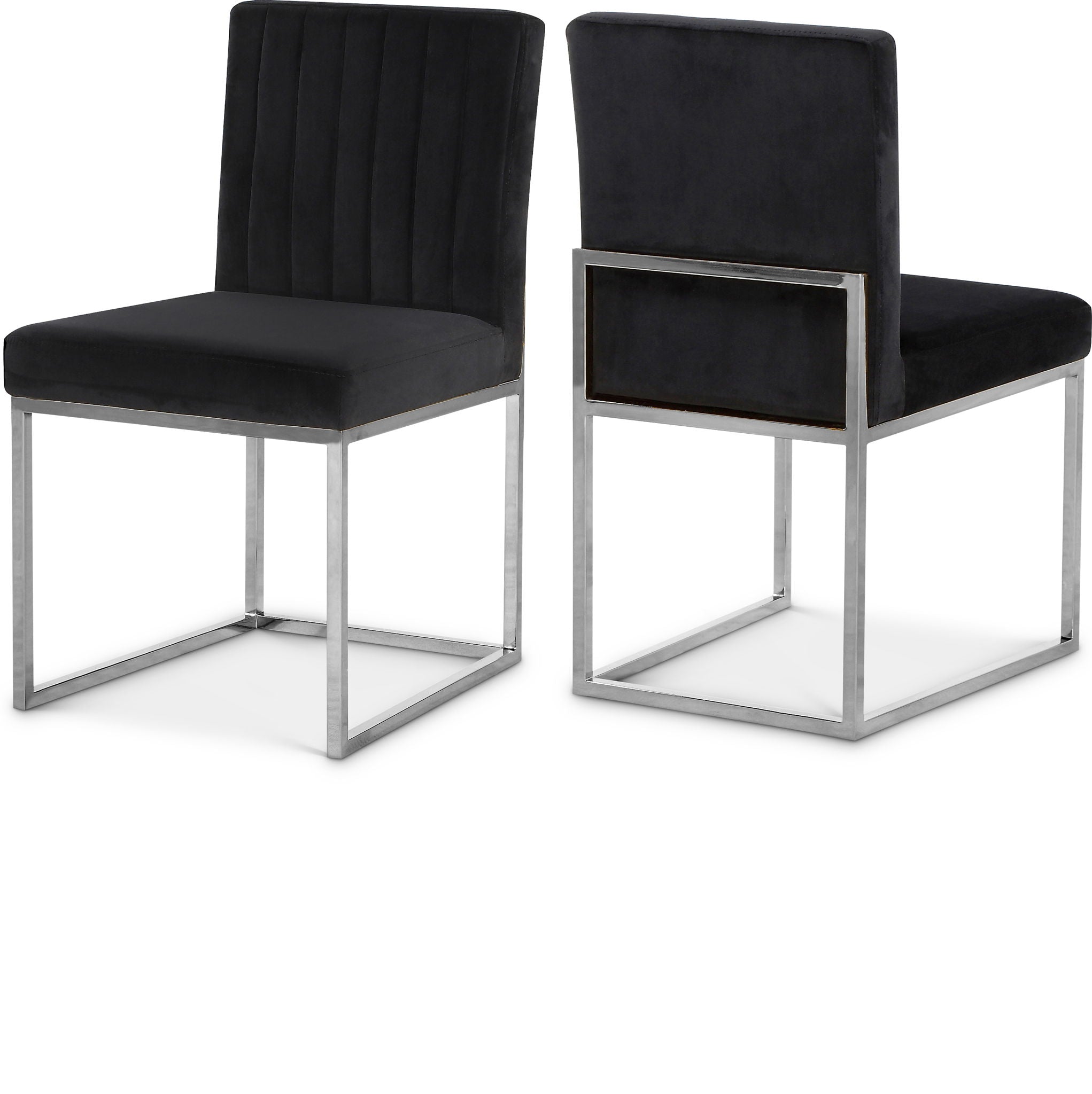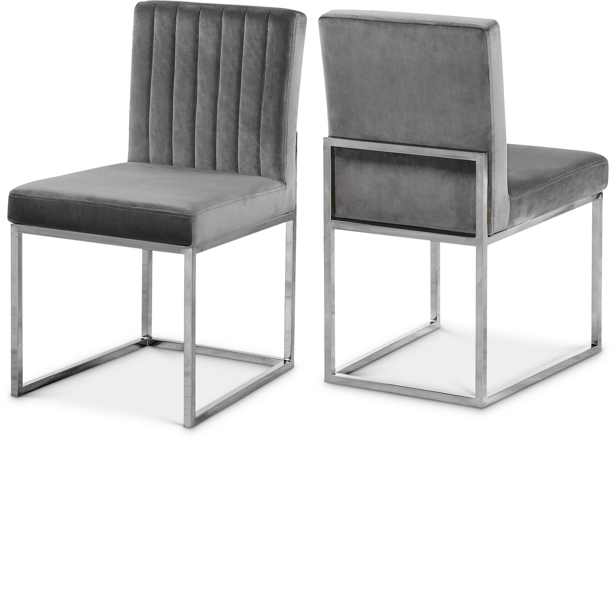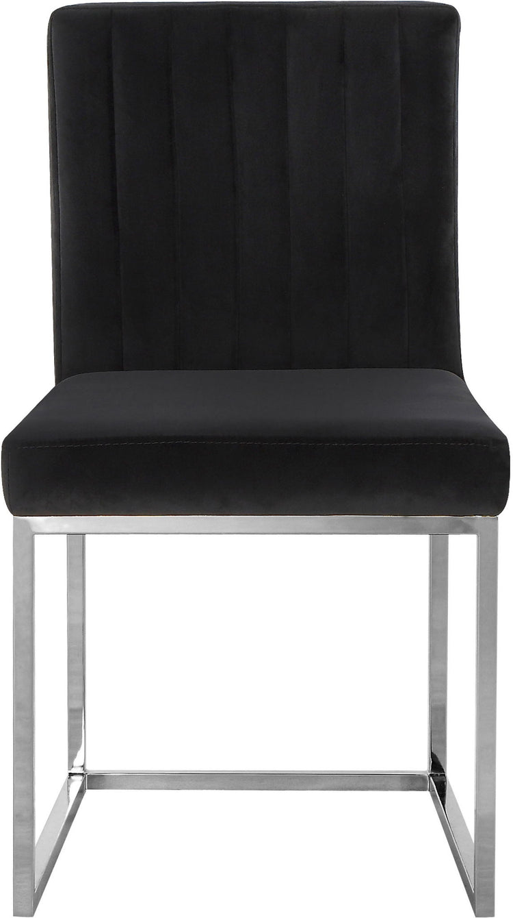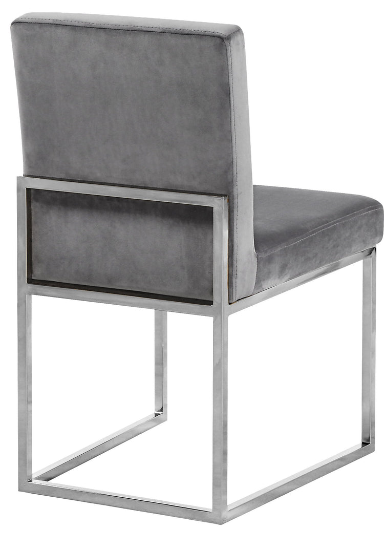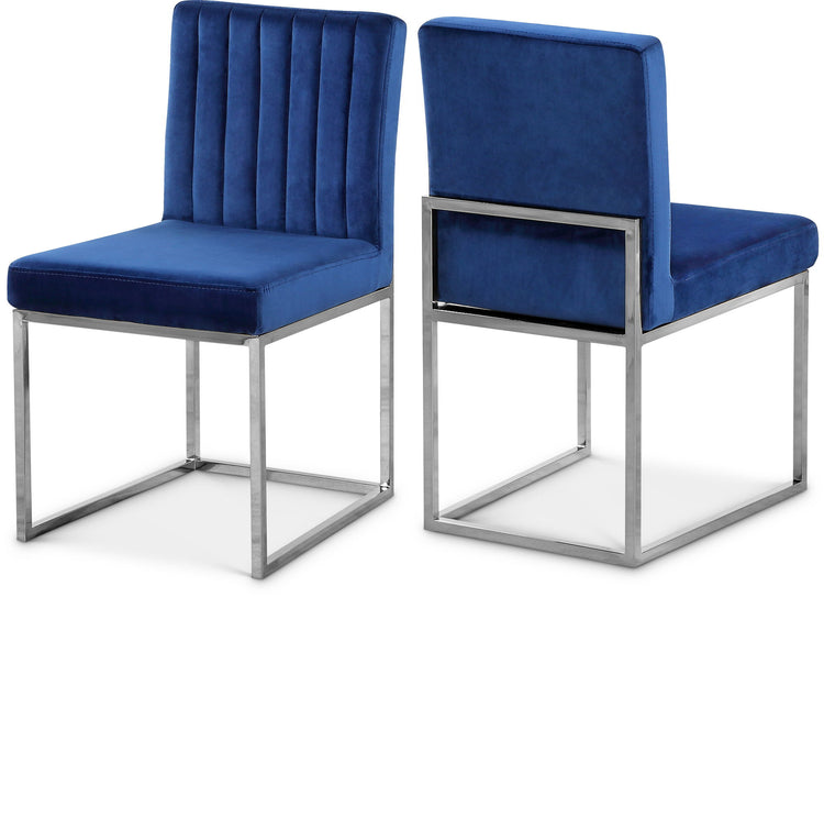 Take dining to a posh new level with this Giselle Dining Chair. A boxy design makes it a nice addition to contemporary spaces, and it's armless design makes it easy to get into and out of with ease. The seat and back are upholstered in rich velvet for a lavish vibe and a pop of sumptuous color to liven up your room, and both are padded well to make sure diners stay comfy while they enjoy their meal. The metal frame is finished in silver for added beauty and aesthetic appeal.