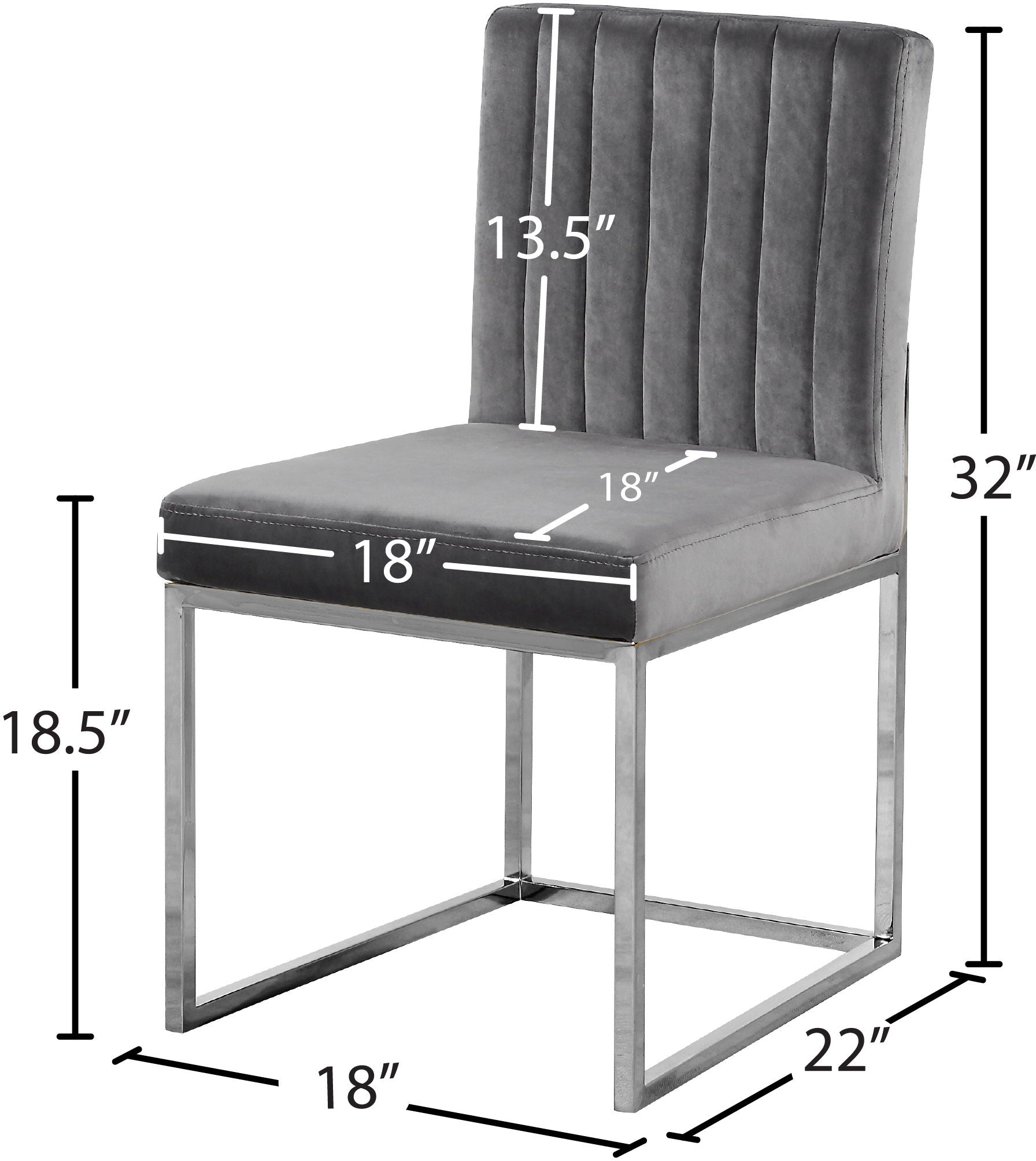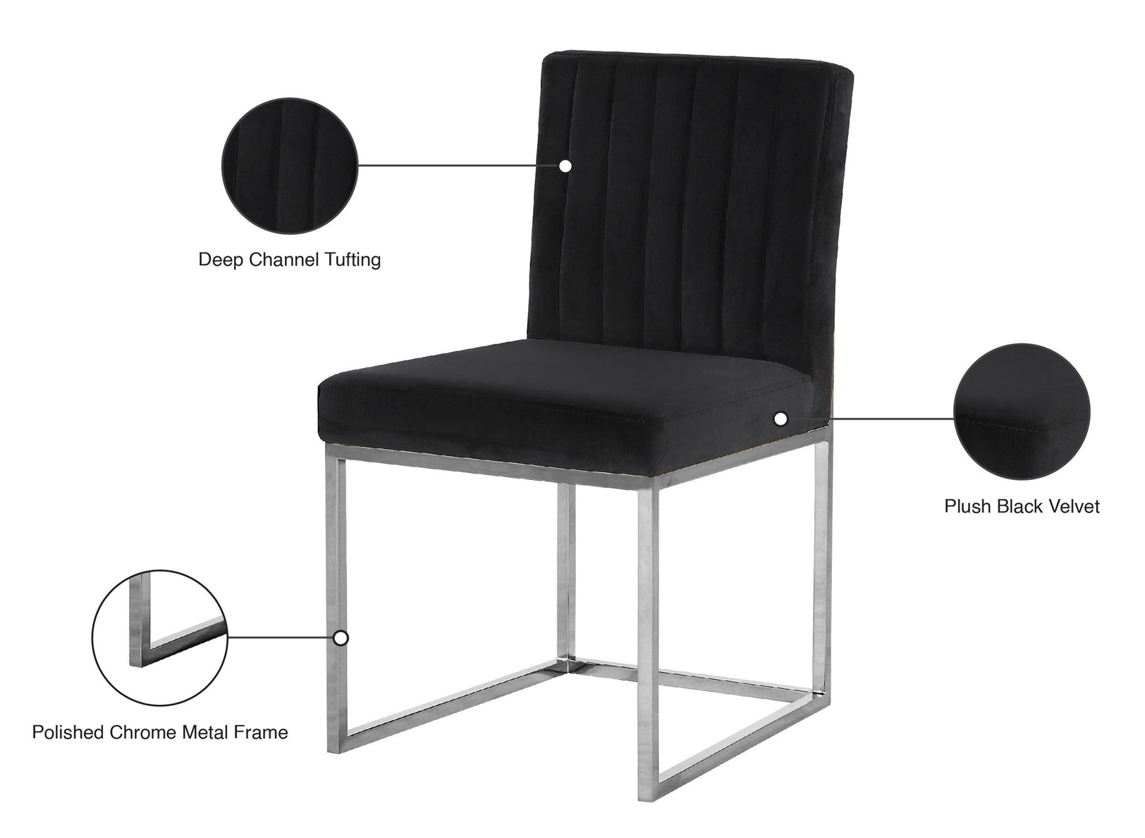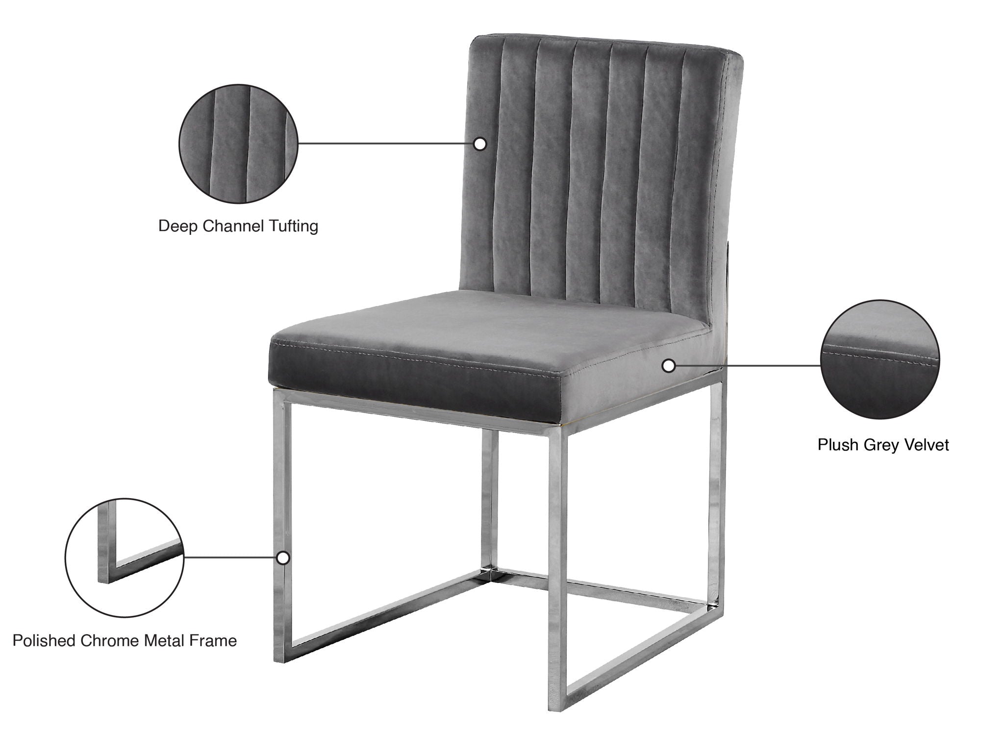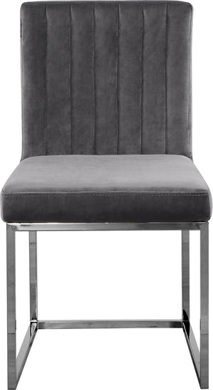 Take dining to a posh new level with this Giselle Dining Chair. A boxy design makes it a nice addition to contemporary spaces, and it's armless design makes it easy to get into and out of with ease. The seat and back are upholstered in rich velvet for a lavish vibe and a pop of sumptuous color to liven up your room, and both are padded well to make sure diners stay comfy while they enjoy their meal. The metal frame is finished in silver for added beauty and aesthetic appeal.