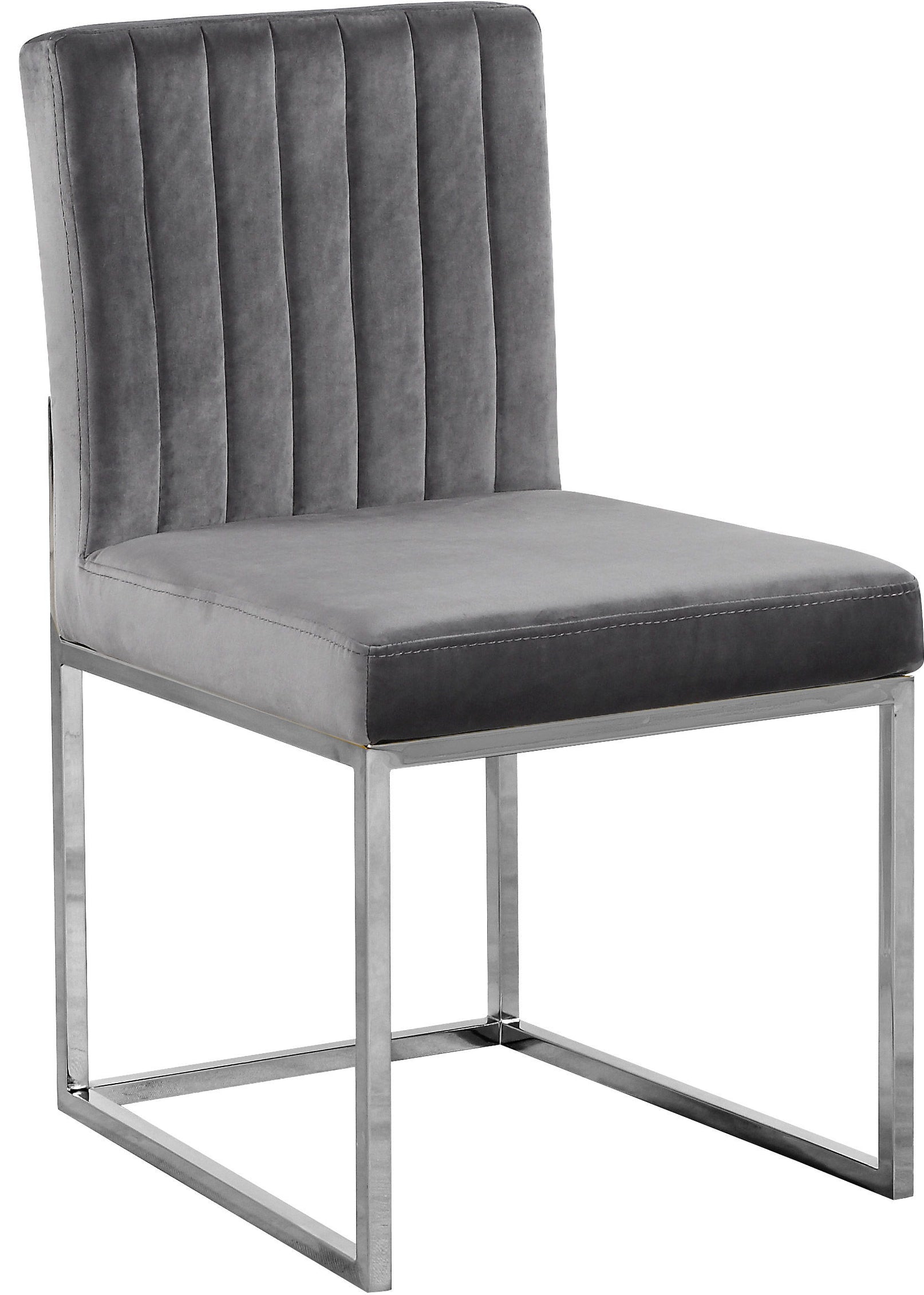 Take dining to a posh new level with this Giselle Dining Chair. A boxy design makes it a nice addition to contemporary spaces, and it's armless design makes it easy to get into and out of with ease. The seat and back are upholstered in rich velvet for a lavish vibe and a pop of sumptuous color to liven up your room, and both are padded well to make sure diners stay comfy while they enjoy their meal. The metal frame is finished in silver for added beauty and aesthetic appeal.