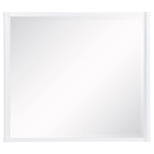 This dresser mirror completes any bedroom with its balanced shape and subtly rounded profile. Framed in a bright white finish, it features soft curves that echo the collection’s clean, modern design. Built from engineered wood and a clear glass panel, it brings light, height, and symmetry to the space. Designed to mount securely to the matching dresser, it’s a refined accent with practical elegance.