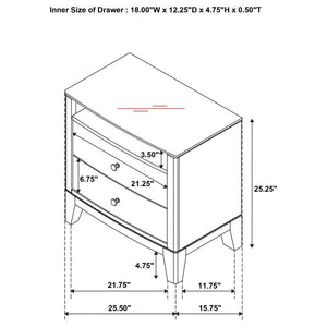 This nightstand is a perfect blend of style and functionality, featuring a natural pine finish that exudes a warm and inviting aura. Its top drawer offers cord management access, ideal for recharging devices conveniently. The piece's softly curved fronts and tempered glass top add a modern twist to its classic design. Square tapered legs enhance its sturdy yet elegant structure, making it a versatile addition to any bedroom. Complemented by antique nickel hardware, this nightstand is both practical and stylish.