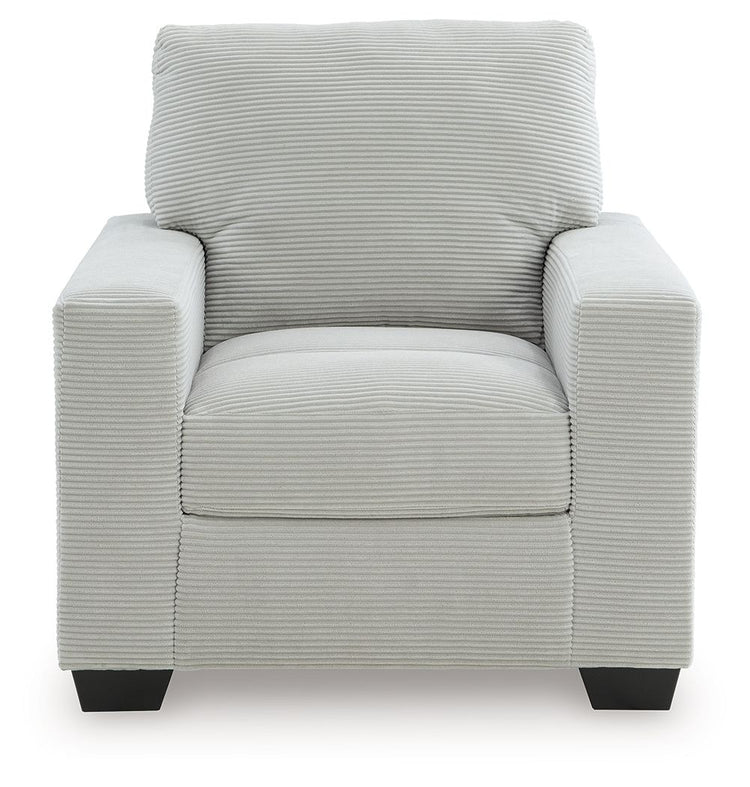 The crisp neutral hue and striking design details of this chair create a living room that expertly reflects your modern taste. For irresistibly cool textural appeal, the ultra-soft fabric is enhanced by a small-scale corded look. With a clean-lined silhouette complete with track arms, this chair allows you to take a trend-right approach to everyday living.