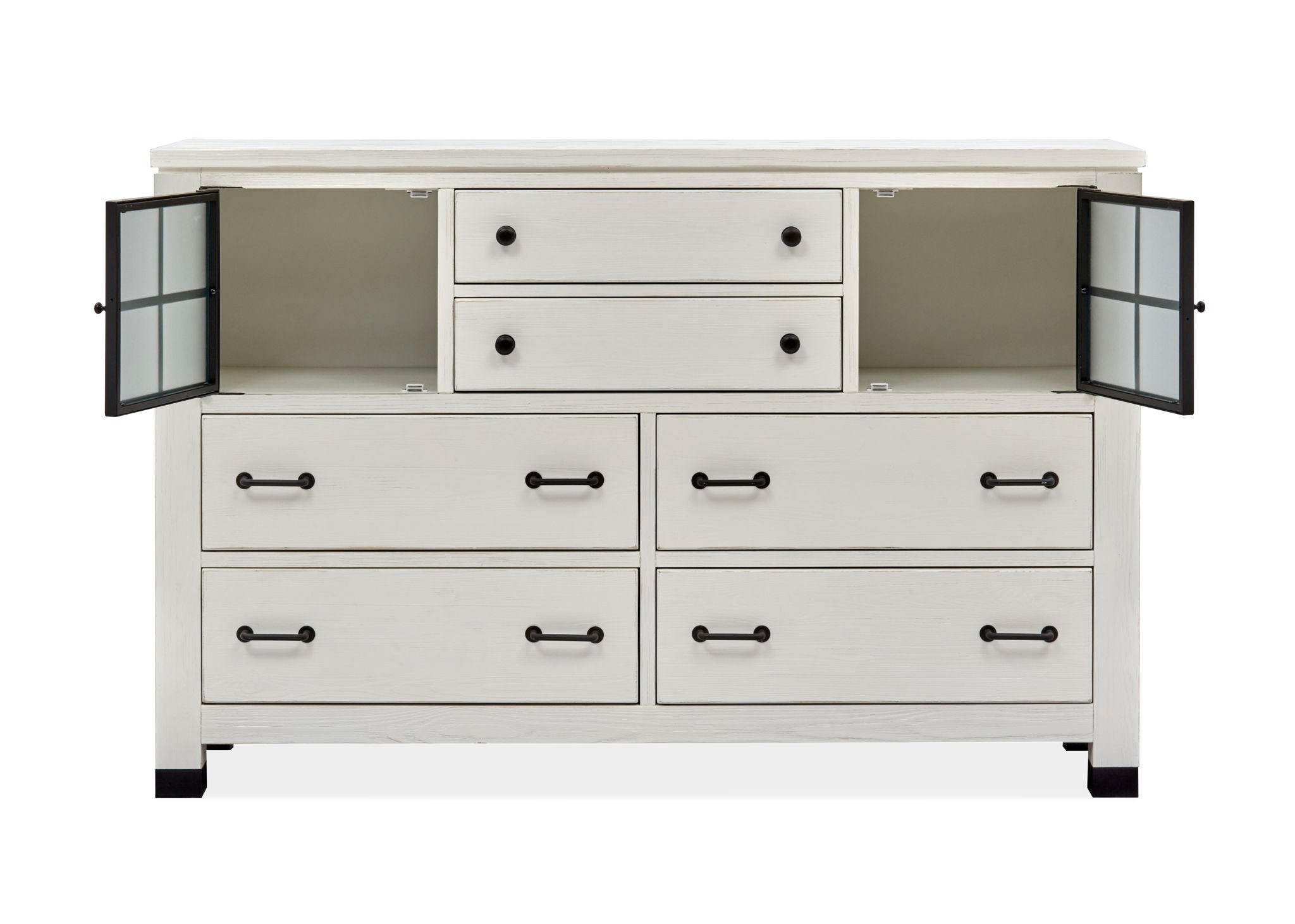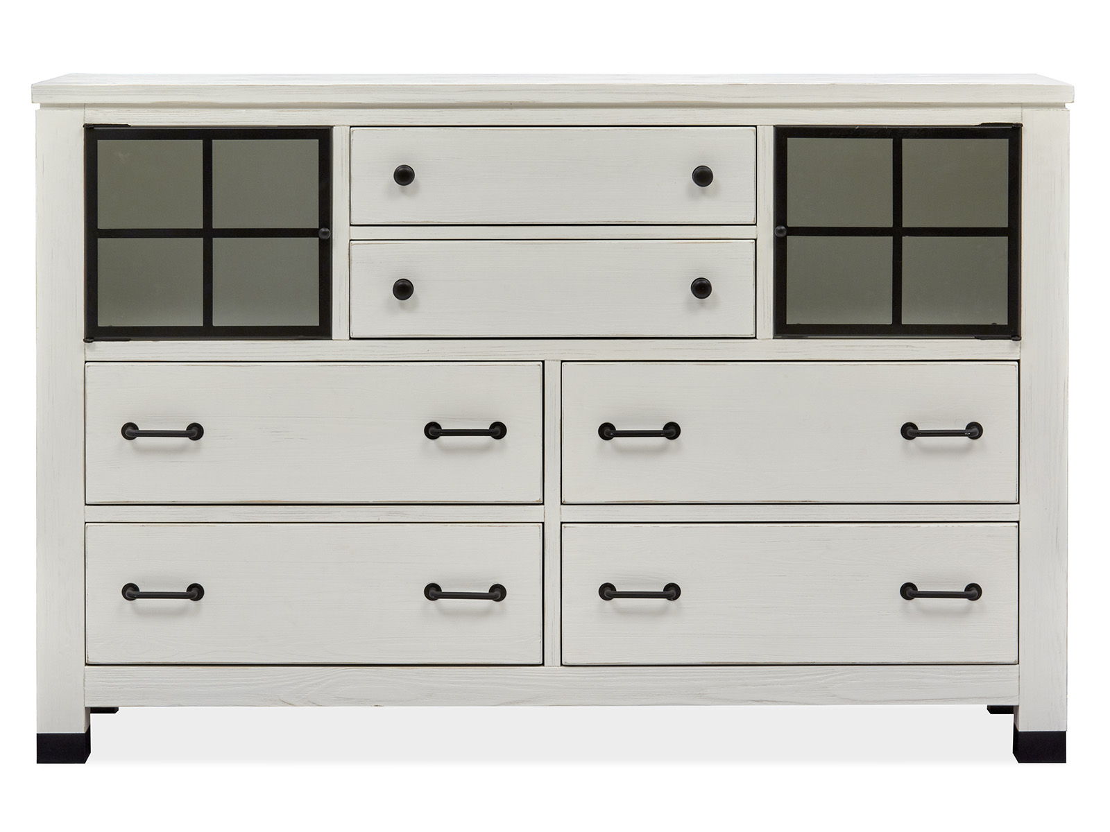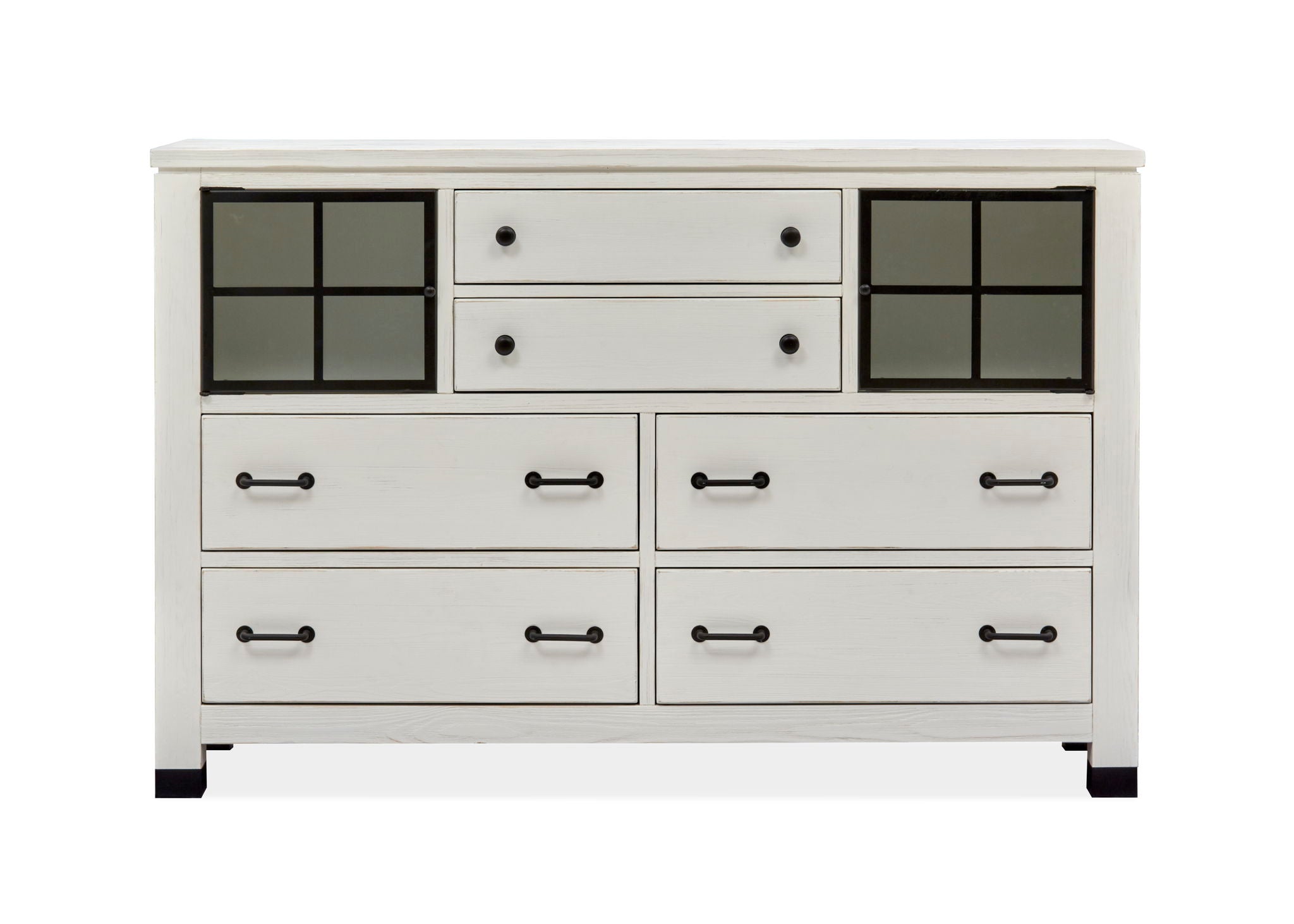 Farmhouse fresh meets industrial chic in the Harper Springs Collection. The board-and-batten construction of the signature panel bed evokes architectural details from 19th and 20th Century farmhouses, and window-pane motifs in textured glass on key pieces are inspired by the black metal windows of classic farmhouses and reclaimed factories. Black metal ferrules, corner brackets and forged iron hardware bring an industrial modern vibe to the craftsmen-like silhouettes. A black metal bed and a black mirror with window-pane border provide a dramatic contrast to the soft Silo White finish with rub-through and distressing. Harper Springs is crafted of random-width solid Pine for an authentic and casual feel. Whether you aspire to loft living or country living, the Harper Springs Collection will bring your dream home to life.