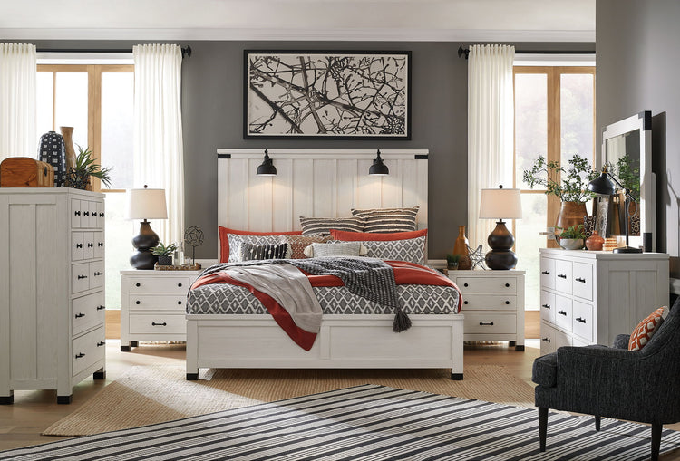 Farmhouse fresh meets industrial chic in the Harper Springs Collection. The board-and-batten construction of the signature panel bed evokes architectural details from 19th and 20th Century farmhouses, and window-pane motifs in textured glass on key pieces are inspired by the black metal windows of classic farmhouses and reclaimed factories. Black metal ferrules, corner brackets and forged iron hardware bring an industrial modern vibe to the craftsmen-like silhouettes. A black metal bed and a black mirror with window-pane border provide a dramatic contrast to the soft Silo White finish with rub-through and distressing. Harper Springs is crafted of random-width solid Pine for an authentic and casual feel. Whether you aspire to loft living or country living, the Harper Springs Collection will bring your dream home to life.