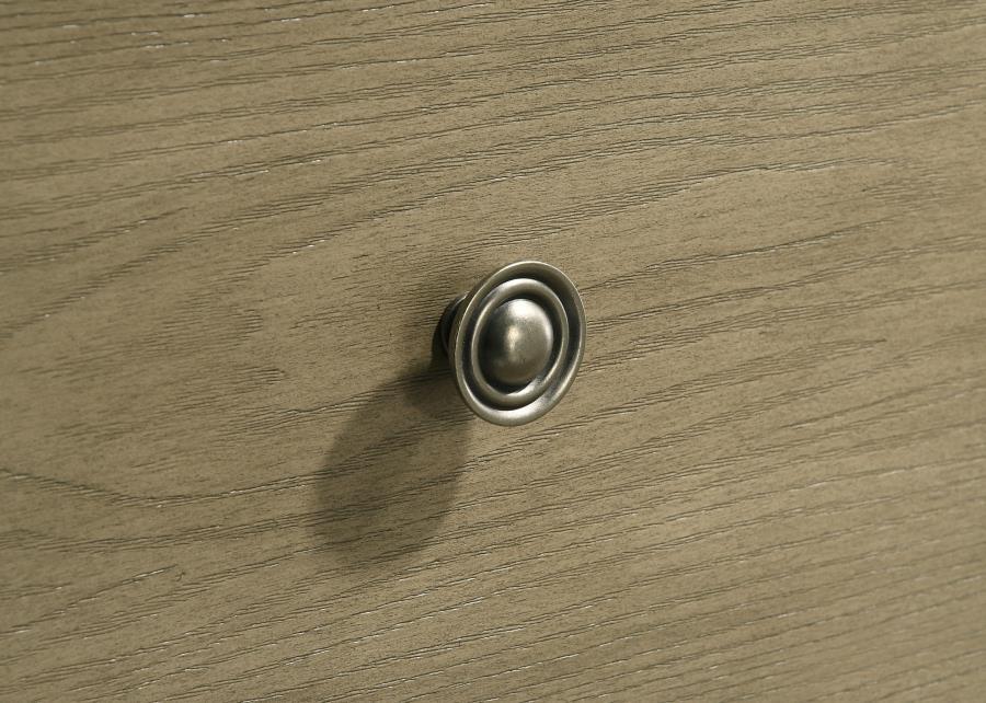 Bring natural character and clean structure into your bedroom with this transitional suite, defined by a slatted headboard, refined trim, and antique nickel accents. A warm vineyard oak finish highlights the embossed oak grain across the bed and coordinating case pieces. Smooth-gliding drawers offer generous storage with heavy-duty metal ball bearing extension slides for lasting durability. Crafted from rubberwood and engineered wood veneer, this collection balances modern practicality with timeless charm.