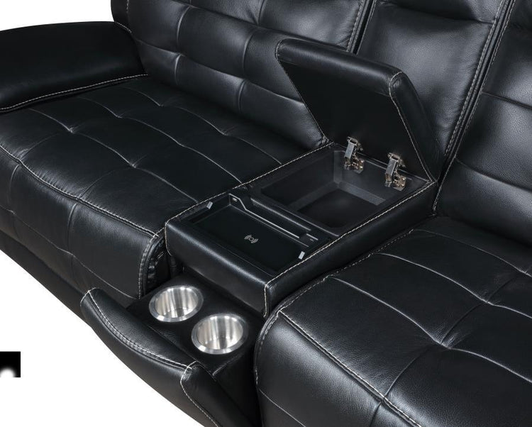 Experience ultimate luxury and relaxation with this three-piece dual power sectional sofa, crafted with top grain black leather that exudes elegance and durability. The contrast stitching and modern grid tufting design add a touch of sophistication, highlighting the luxurious material. The dual power functionality with power recline and power headrests offers customizable comfort, allowing you to adjust the position of the sectional to your liking with ease. The sectional includes a modern console that combines functionality with convenience, featuring hidden cup rests with removable stainless steel cup holders, a soft-close storage compartment, a USB-C charging port, and a wireless charger. Recline fully and find your perfect angle for ultimate relaxation with this beautifully designed sectional.