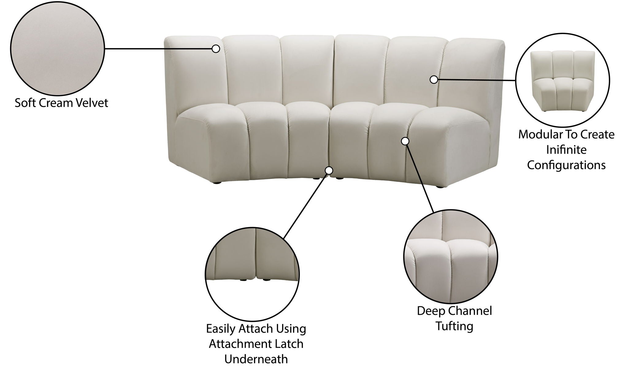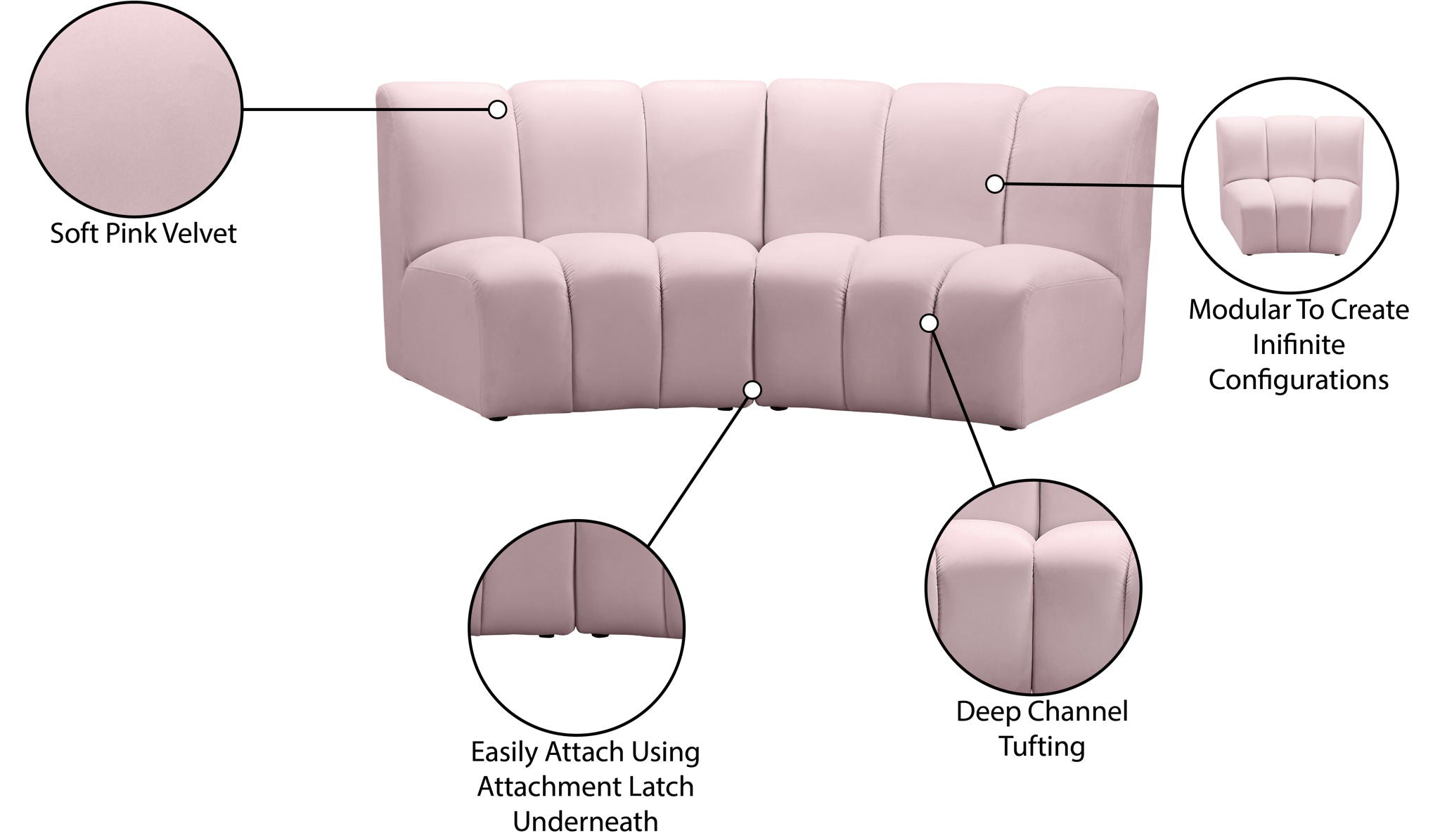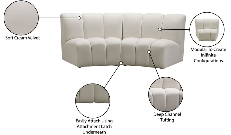 Create a seating group that works for every possible situation with this Infinity modular love seat and other pieces in the Infinity collection. Upholstered in soft velvet material that feels great against the skin and offers long-wearing beauty, this piece fits with other Infinity items for an infinite number of combinations that get your seating requirements just right but that look just as nice when used on their own.