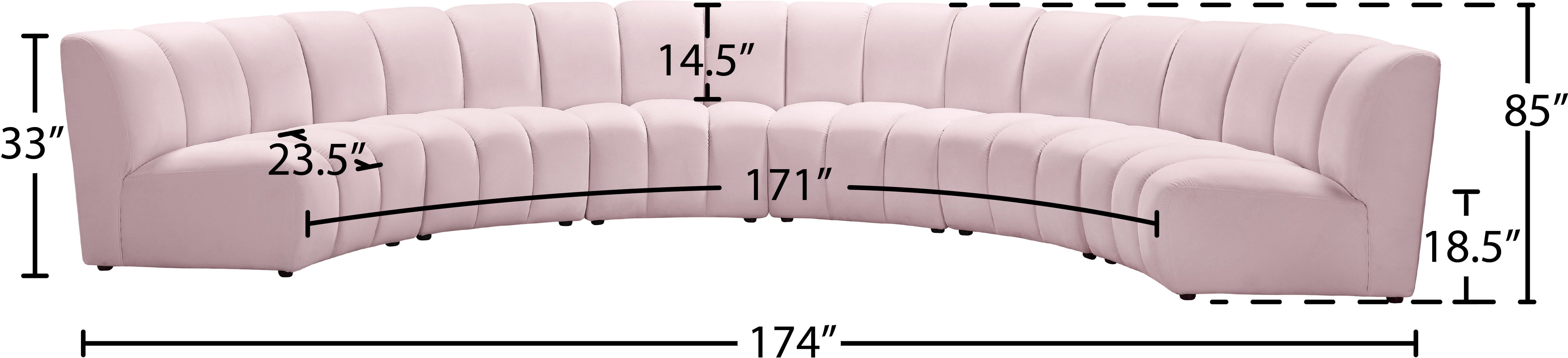 Create a seating group that works for every possible situation with this Infinity modular 6-piece sectional and other pieces in the Infinity collection. Upholstered in soft velvet material that feels great against the skin and offers long-wearing beauty, this piece fits with other Infinity items for an infinite number of combinations that get your seating requirements just right but that look just as nice when used on their own.