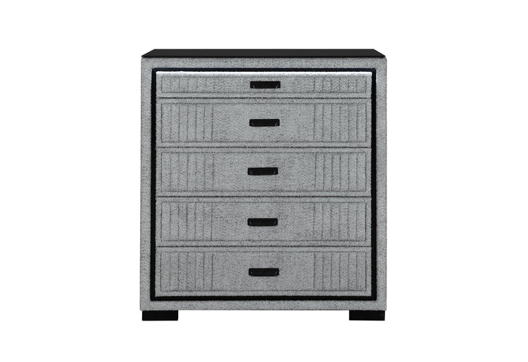 The Isabella Chest brings together elegant design and everyday utility. Featuring fluted grey fabric drawer fronts, this tall chest offers ample storage and includes built-in LED lighting for a sleek, ambient touch that enhances its upscale feel.