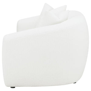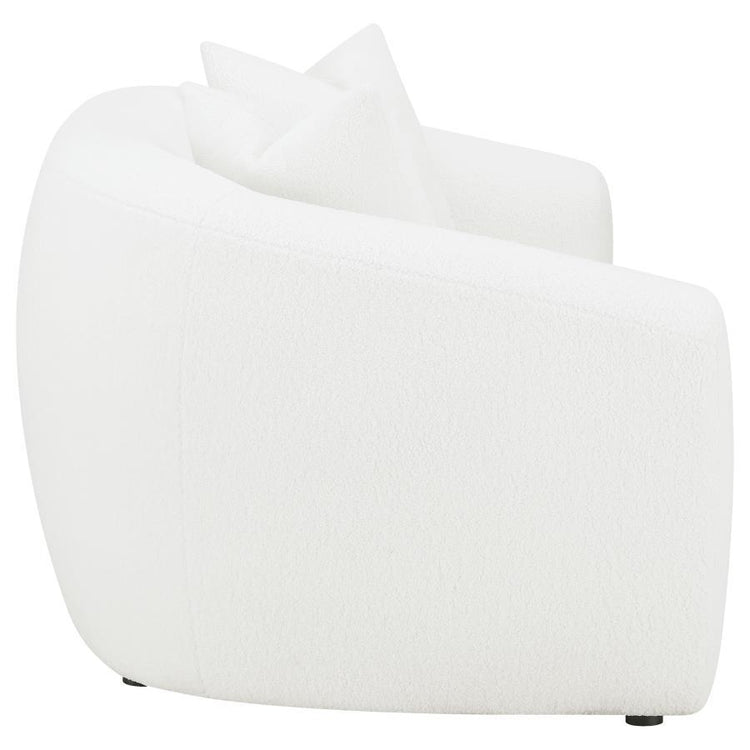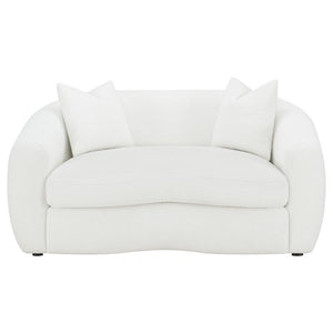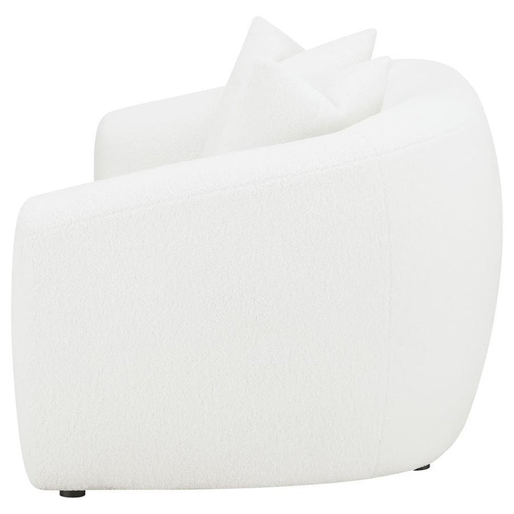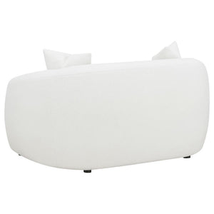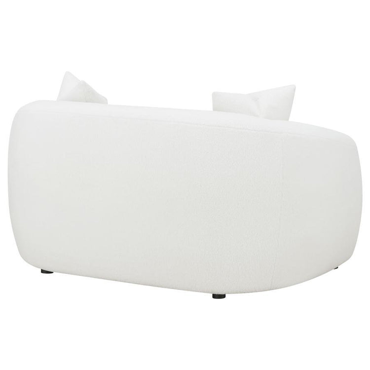 Invite cozy sophistication into your home with this elegantly contoured loveseat, upholstered in soft faux sheepskin boucle fabric. Its curved silhouette and sloped armrests create a smooth, cloud-like form that exudes modern charm. A single plush seat cushion offers comfortable support, while matching faux down-filled accent pillows add refined warmth. Supported by black legs for a hint of contrast, this loveseat blends contemporary elegance with inviting texture, perfect for modern and transitional interiors.
