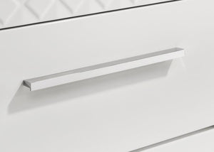Organize your wardrobe in style with this contemporary chest. The high gloss finish and 3-dimensional diamond tile emboss provide a chic, modern look that enhances any bedroom decor. Five spacious drawers offer ample storage for clothing and linens, each with felt lining in the top drawers to protect your delicate items. The chest is built with robust materials and English dovetail joinery, ensuring durability and smooth functionality. This piece is both practical and stylish, perfect for a modern home.