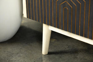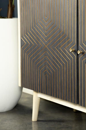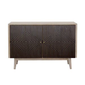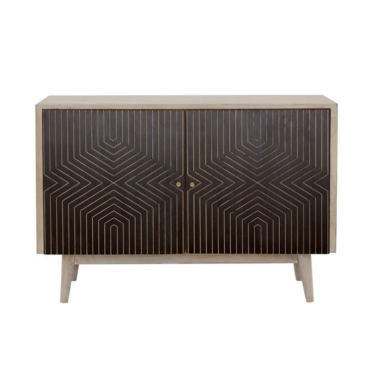 - Crafted in India from solid mango wood, its gold geometric pattern forms an eye-catching diamond design on each cabinet door against a black finish