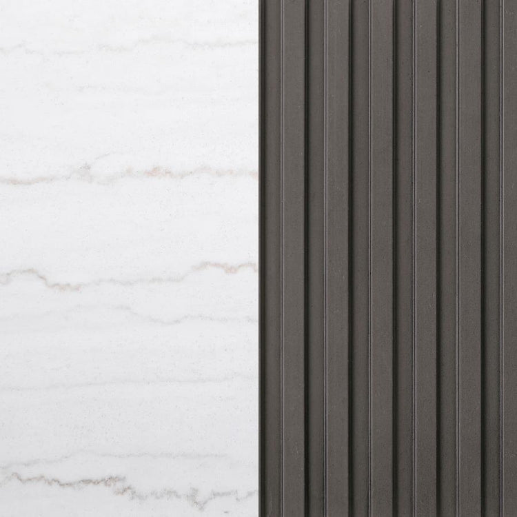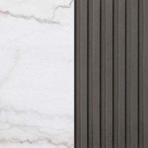 Center your living space with this elegant, modern round table. The genuine marble top exudes sophistication with its subtle veining, adding organic flair. The clean, light coloration complements any surrounding decor. A ribbed, engineered wood frame in a charcoal finish creates texture and depth, while the brushed gold metal base brings a luxurious touch. This piece seamlessly blends refined materials and design, making it the perfect addition to your living room.