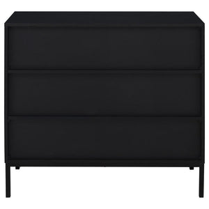 Enhance your dining or living space with this sleek black sideboard, elegantly shaped with subtle arches and showcasing framed fluted tempered glass doors. Inside, adjustable shelves provide flexible storage for dinnerware and décor, while its minimalist profile rests on slender metal legs for a refined touch. Constructed from engineered wood and laminate veneer, this versatile piece blends durability, easy maintenance, and understated style, seamlessly complementing modern interiors.