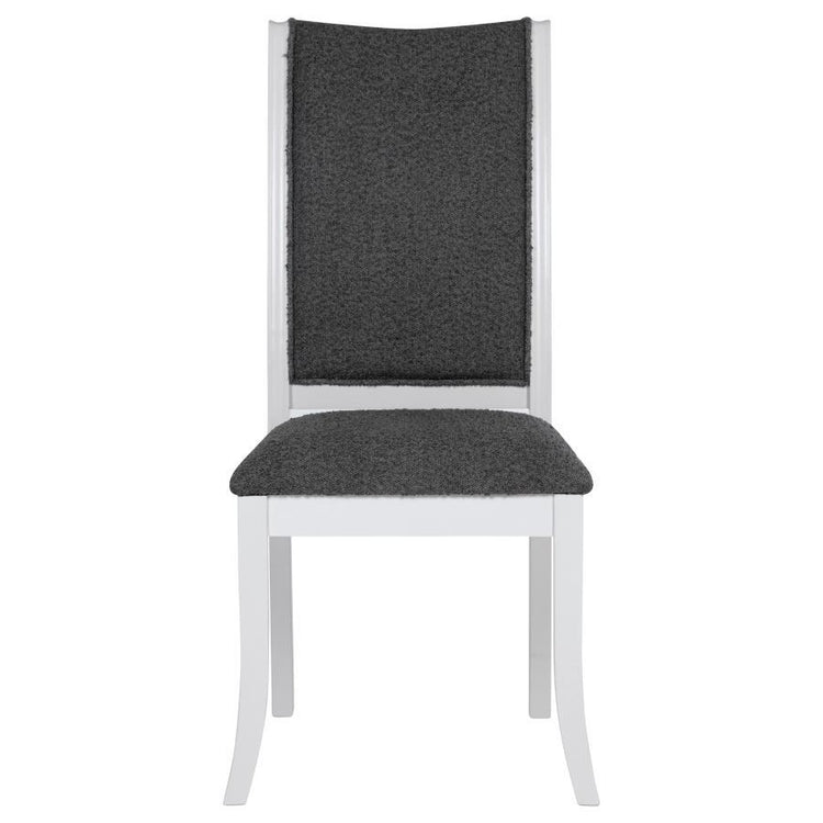 Embrace a modern minimalist presentation with this contemporary dining set. It centers on a roomy round dining table that seats four to six, with flared legs and a round shelf that adds stability and decorative potential. The set adds side chairs, each with a tall, structured silhouette and dark gray upholstery over plush foam cushions. A pearl white finish is clean and fresh, offering plenty of contrast against the gray. The set instills a clean, precise aesthetic, perfect for minimalist or maximalist decor themes.
